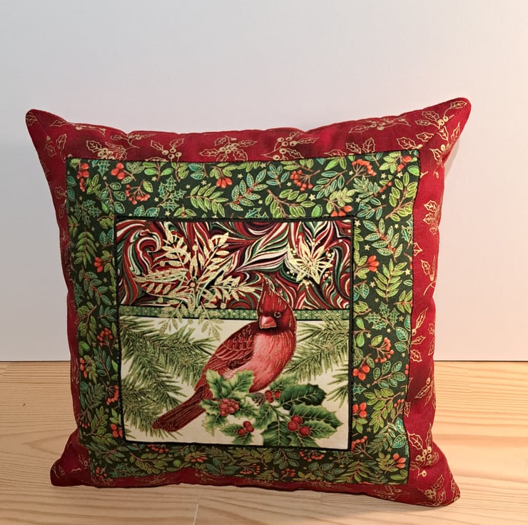 Small Christmas patchwork cushion with cardinal bird and berries ,snow flakes, and stars pattern in burgundy,green ivory and red colors with golden metallic details. Size of the cushion 30x30cm.( 12x12") . The patchwork cushion cover closing with invisible zip. Cushion pad included.
