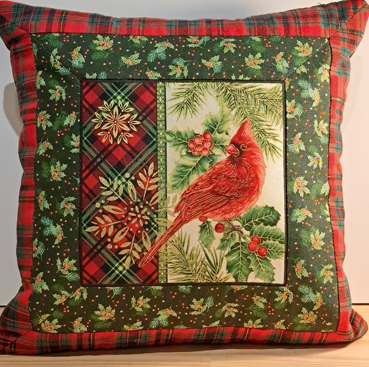 Small patchwork Christmas cushion in burgundy, green ,red and gold colors with cardinal bird,tartan,berries and snowflake patterns. Size of the cushion 30x30cm