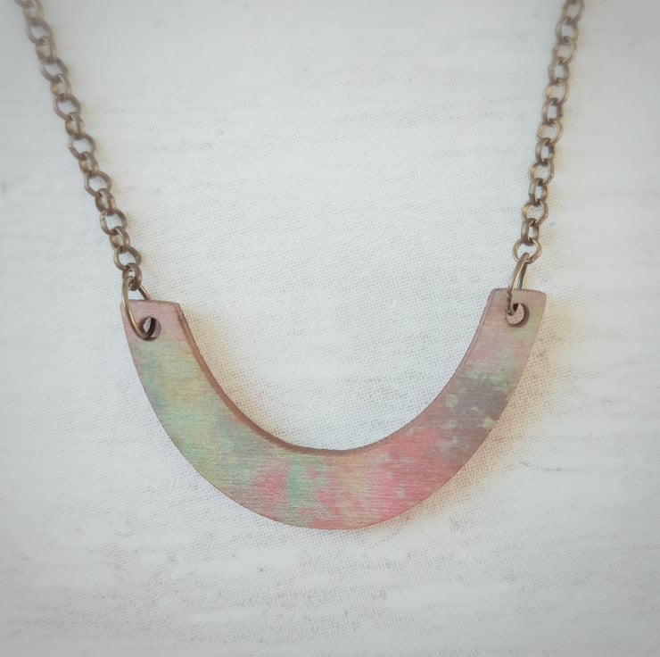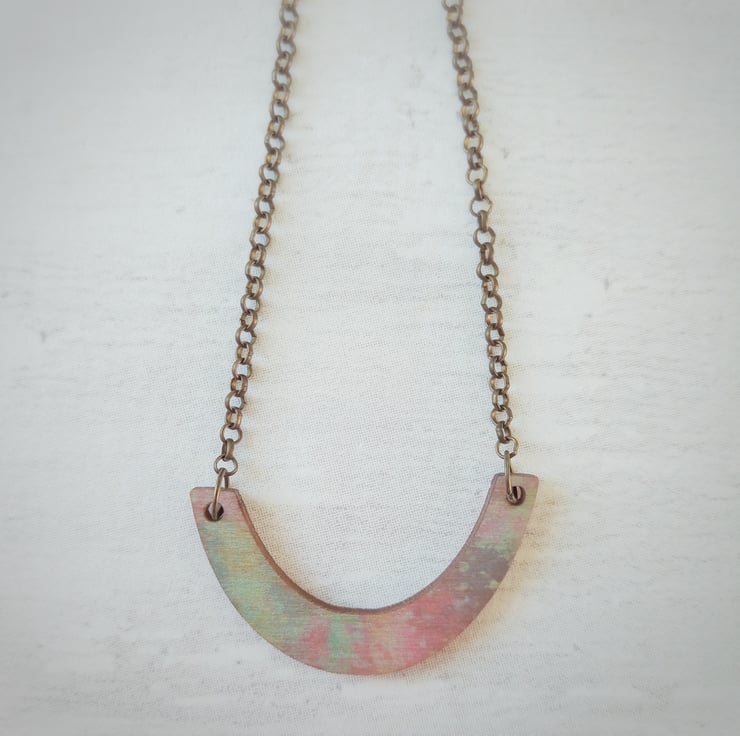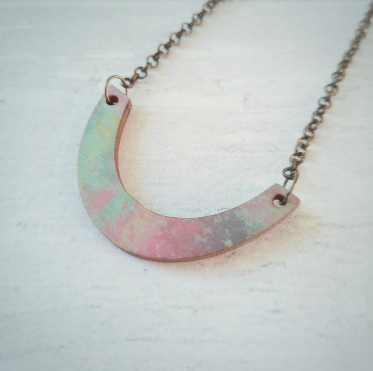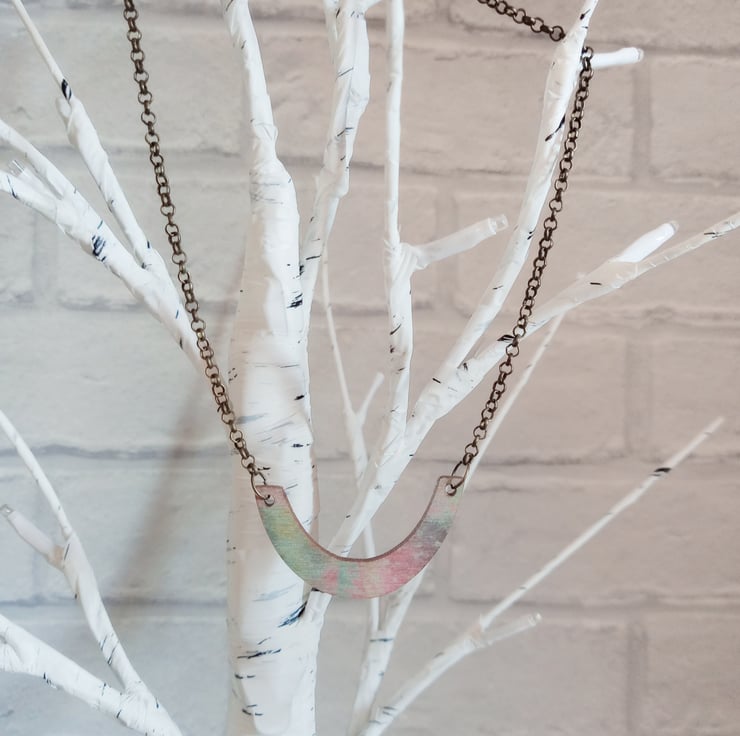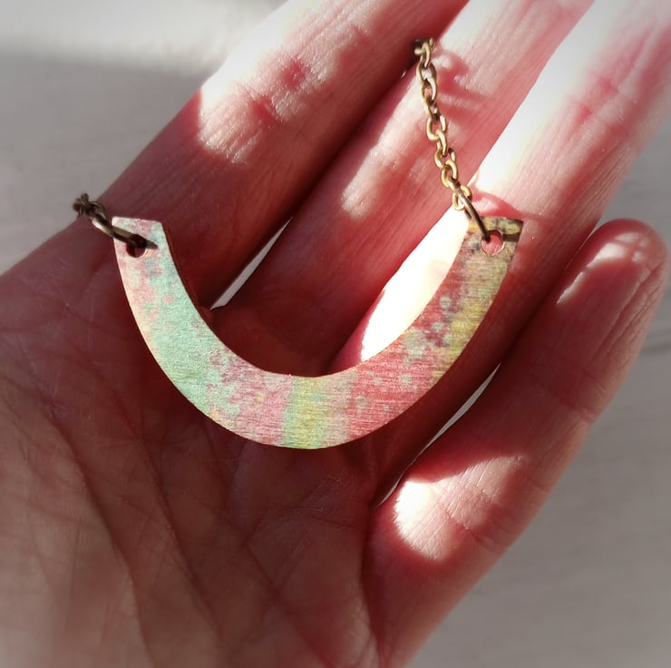This one of a kind wooden arc pendant has been UV printed with splashes of pastel colour and is lightweight and easy to wear. The printed surface adds a satin finish to the wood which changes depending on the light, creating a completely unique accessory...I have tried to photograph it in different lights to give you an idea!