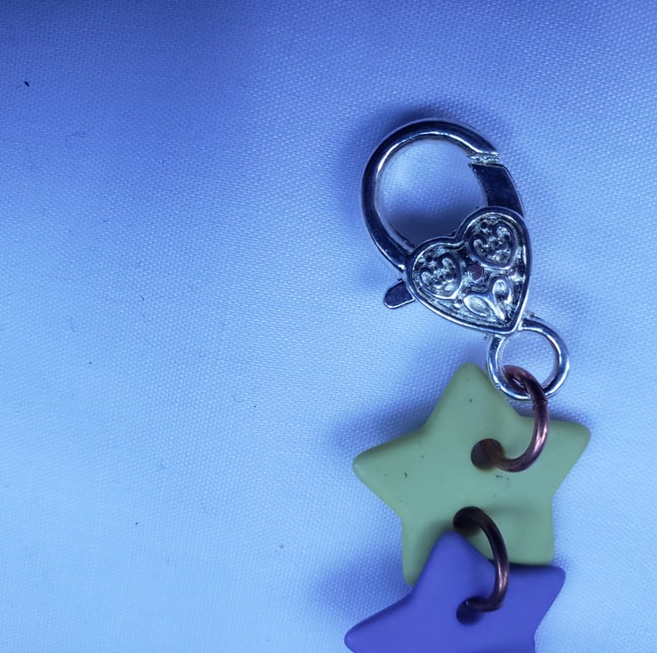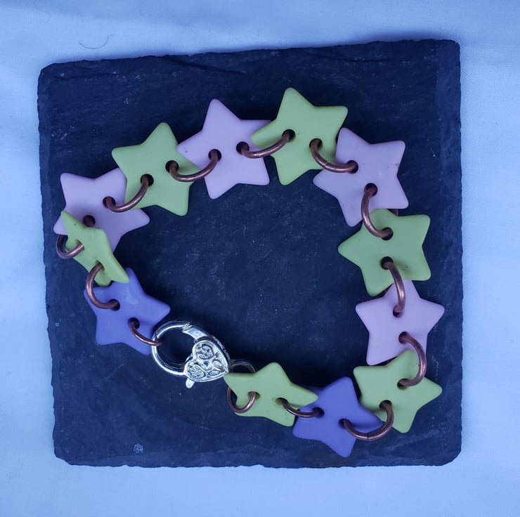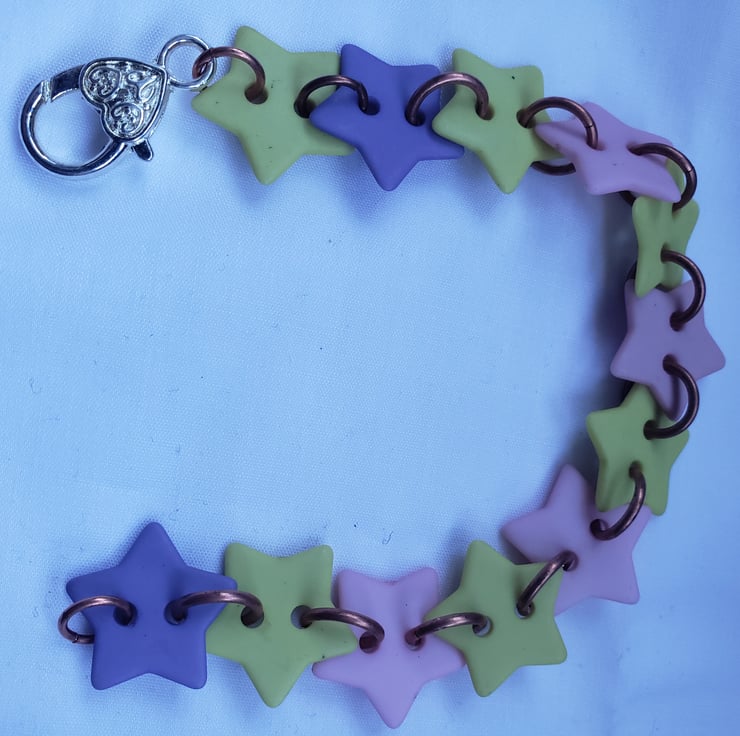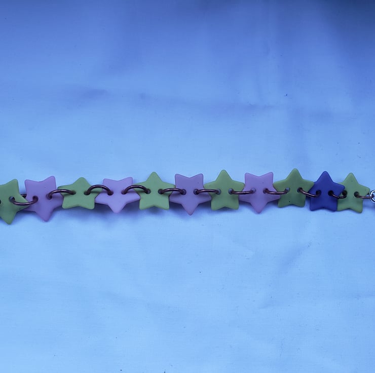 I found some old start shaped buttons and realised I had enough of them to make a bracelet. I've connected them using copper jump rings and attached a large silver lobster clasp. The bracelet is approx 18cm. Perfect if you want something fun, pretty and unique.
