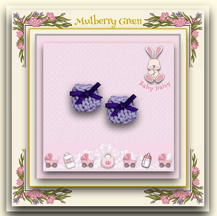 A cute little pair of lavender baby bootees, decorated with gold ribbon bows to fit baby Daisy. The bootees are hand knitted.