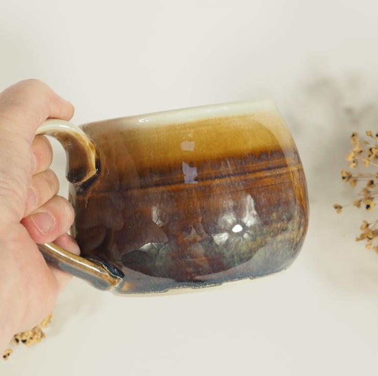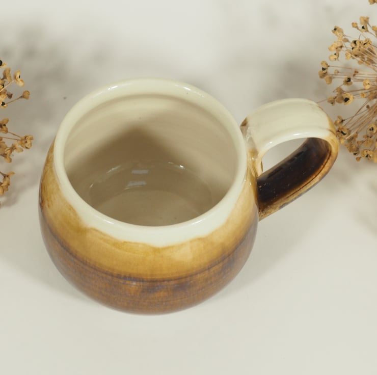 A handmade ceramic mug in a friendly round shape, and an extruded handle.