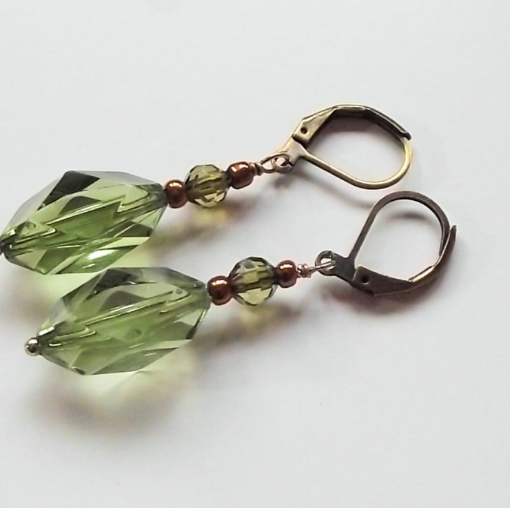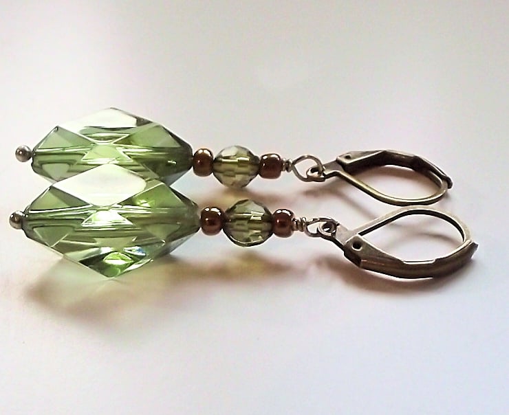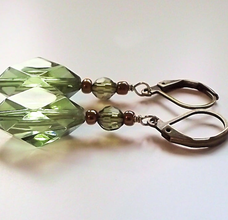 Winter green antique style glass crystal earrings. Recycled winter green faceted diamond shape glass bead, with smaller olive green crystal bead and bronze glass seed beads. Antique bronze plated lever back ear wires and bead post. Earring drop 48mm.