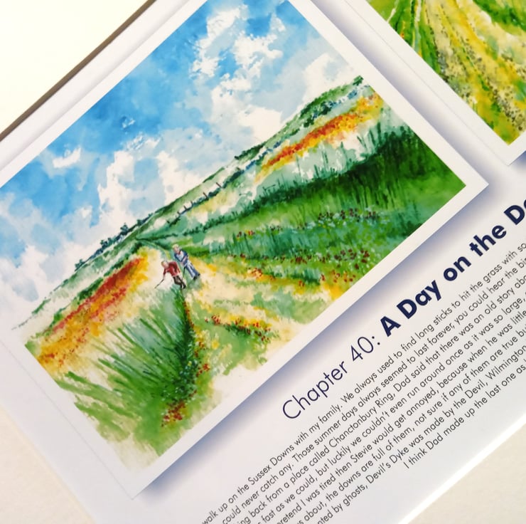 Original hand painted watercolour print of children on the Sussex Southdowns, story for charity. Presented unframed, fully mounted ready for your own frame. (A4 print, mount: 16" x 12"). 'Every picture tells a story.' Taken from the illustrated book 'I am Michael Glare and this is my Life', with over 400 watercolour illustrations like this.