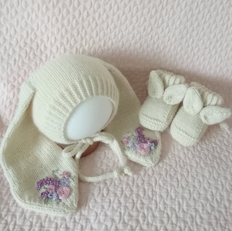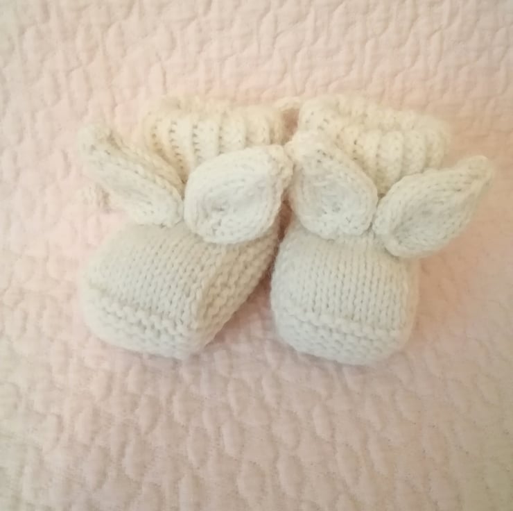 Exquisitely designed and created cute baby hand knitted bunny rabbit booties. These have ears added to the front , they have a fold over leg cuff and an ankle tie that is also knitted in the same yarn and threaded through the booties, this tie fastens into a bow at the back of the ankle.