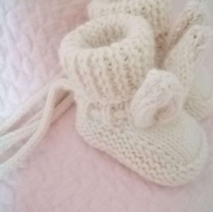 They would make a beautiful gift for an easter baby and are knitted in 65% merion 35% alpaca which gives a slightly fluffy finish. This yarn is an extra special little touch of luxury and is warm and soft on babies skin. It is not exposed to any chemical treatment and needs to be hand washed. They will be delivered in an organza bag.