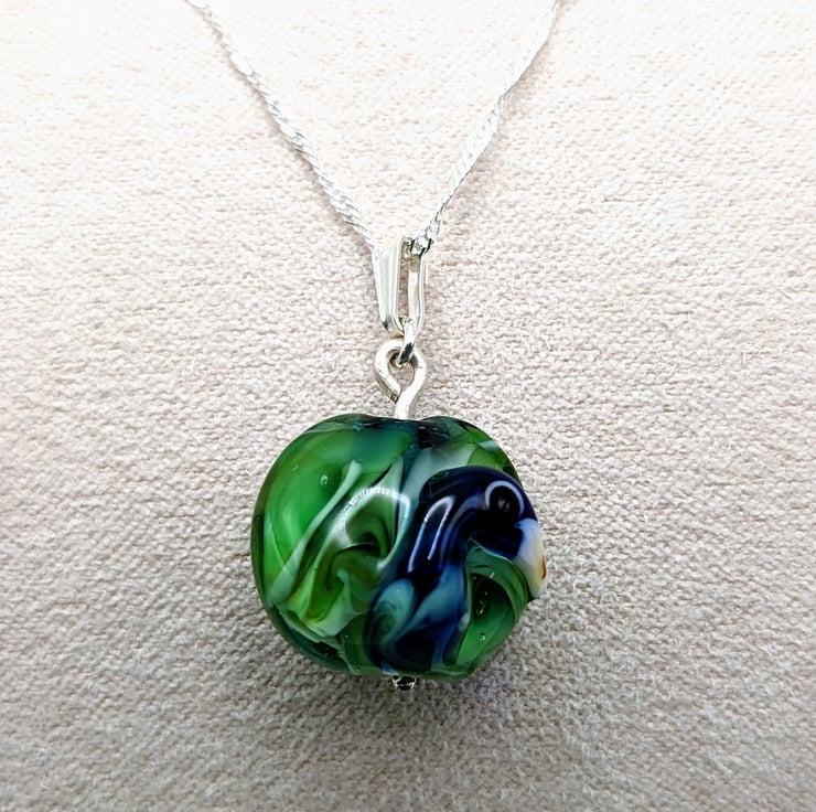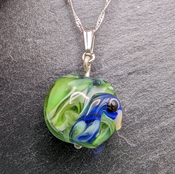 A bespoke lampwork peacock necklace with vibrant green plumes - a quirky necklace for any nature lover. The transparent green glass has been added in layers to create a feather effect and then poked with a tungsten poker to create an air bubble for extra effect. The bead has then been encased with clear glass for added depth. The lampwork bead starts life as simple glass rods that I melt in the flame and onto mandrels. I then add layers of glass and continue to melt and shape in the flame - picture 5 shows the process.