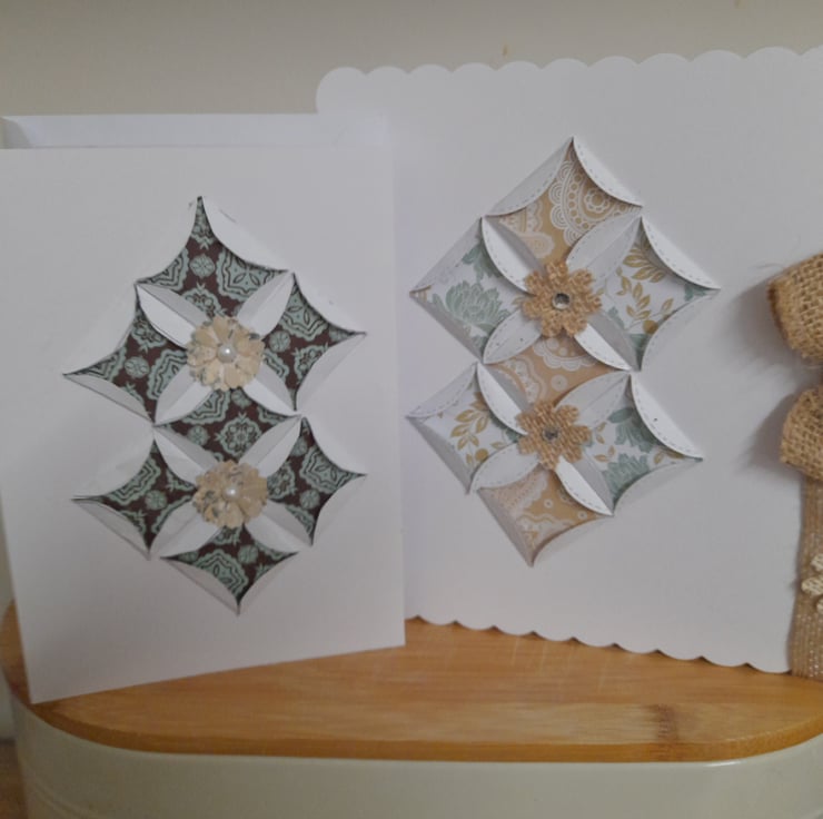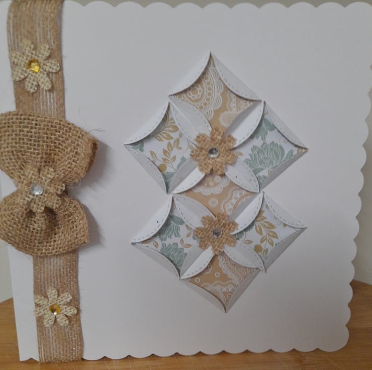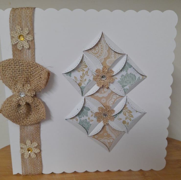 THIS UNIQUE CARD HAS BEEN DESIGNED AND HANDMADE BY MYSELF, USING A LARGE WHITE CARD WITH SCALLOPED EDGES AND DECORATED WITH ORIGAMI TRIANGLES WITH ORIGAMI PAPER IN FLORAL TEAL AND BROWN ALONG WITH BURLAP HESSIAN RIBBON TO DECORATE A BURLAP BOW AND FINISHED WITH LITTLE BURLAP FLOWERS AND RHINESTONES TO DECORATE.