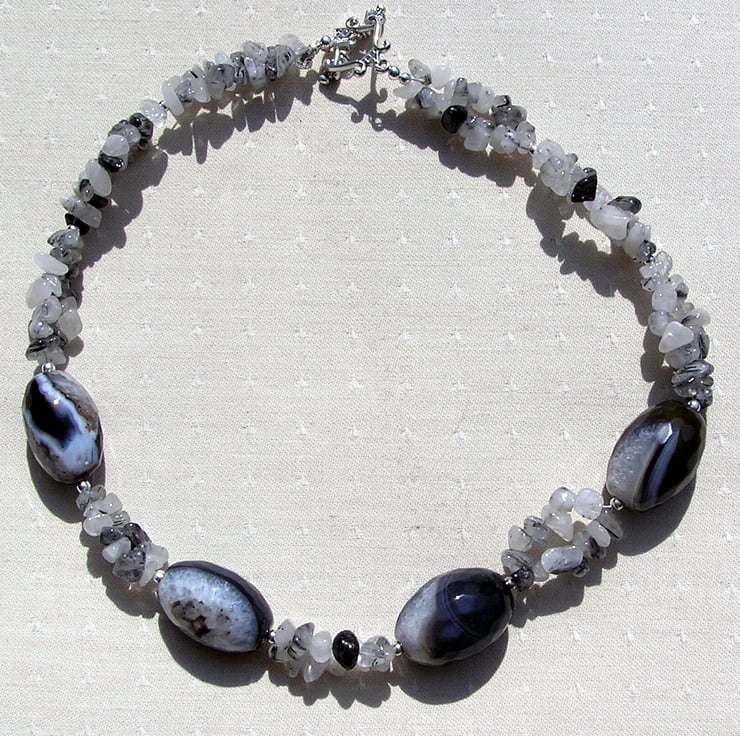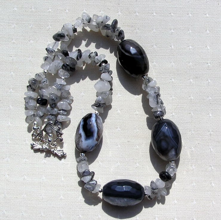 Black Agate & Rutilated Quartz Crystal Gemstone Necklace