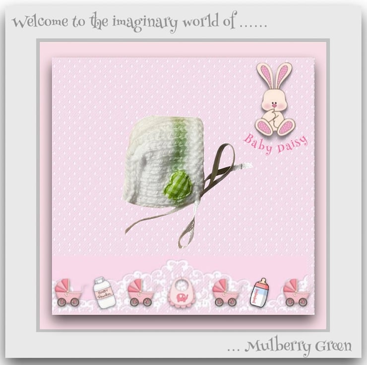 A pretty little white bonnet, decorated with green gingham hearts to fit baby Daisy.