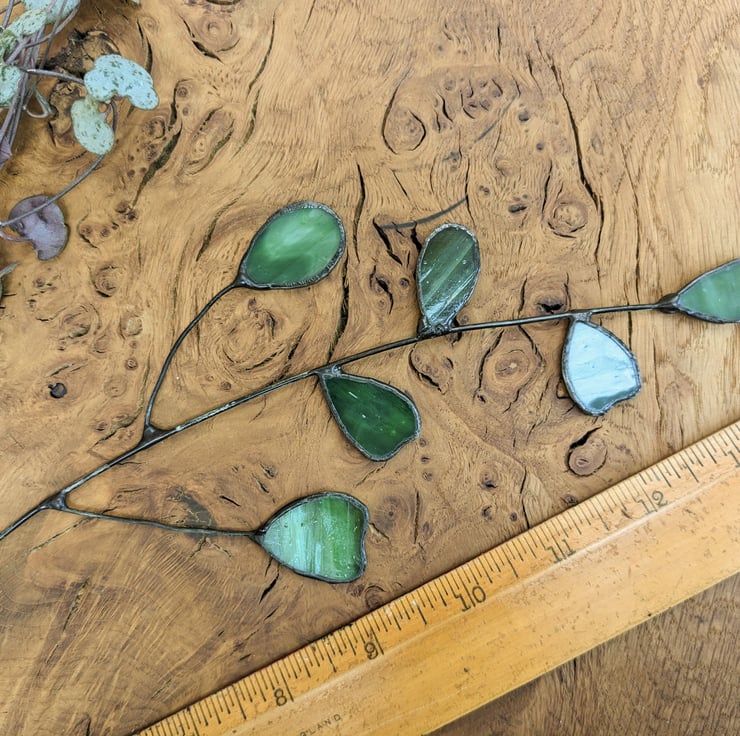 Being handmade, your stem will differ slightly from the photos as the glass shapes are cut entirely freehand replicating the variation seen in nature. The solder around the glass has a black patina, and the wire stem has a variegated gun-metal patina.
