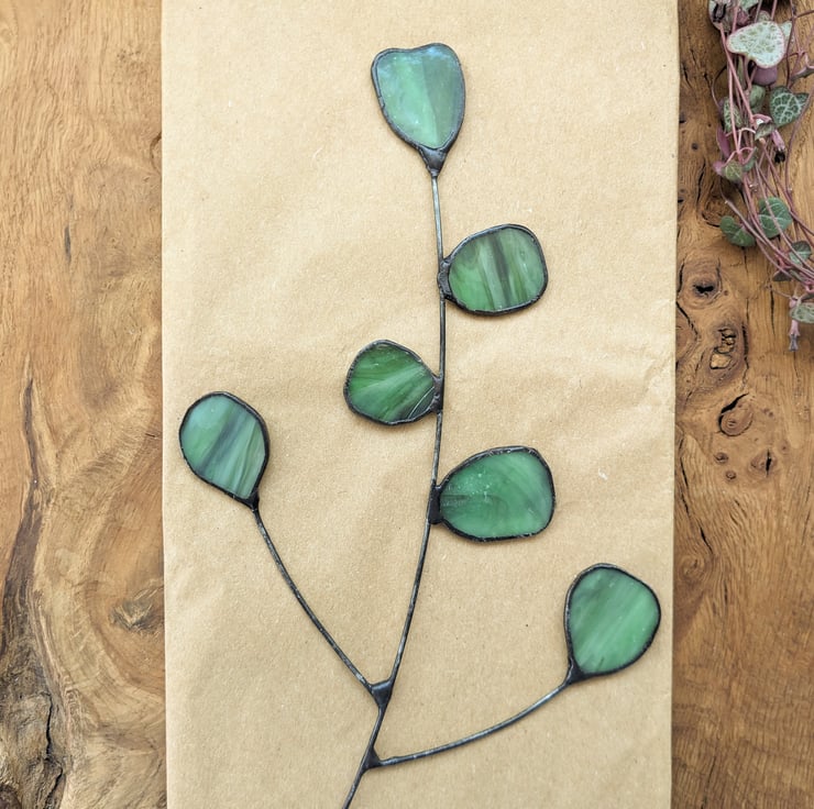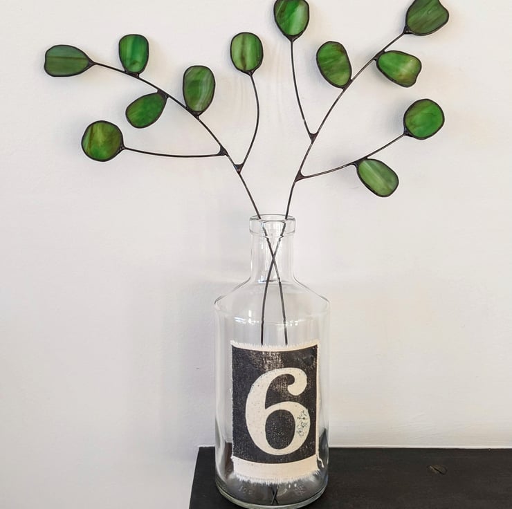 Stained glass leaf stem "Eucalyptus" with six leaves in a rich dark green. Approximately 36 cm high, ideal for vases of 14-18 cm. You can cut the stem with kitchen scissors, and use uncooked rice in your vase to hold the stem in place.