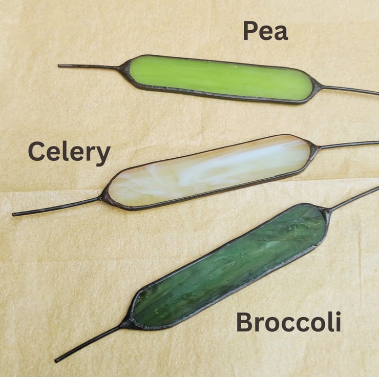 Being handmade, your stem will differ slightly from the photos as the glass shapes are cut entirely freehand replicating the variation seen in nature. The solder around the glass has a black patina, and the wire stem has a variegated gun-metal patina.
