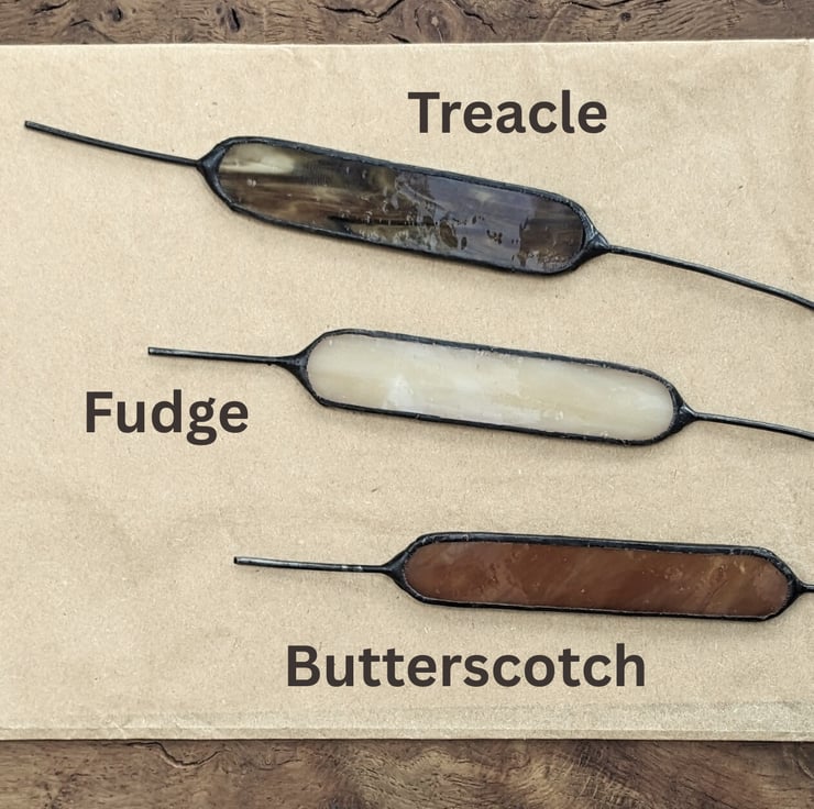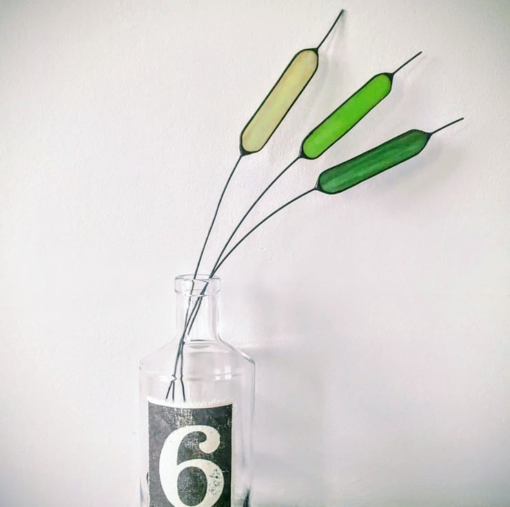 Stained glass "Trio of Bulrushes" in your choice green and brown tones - please refer to the labelled images to identify the colours available. You receive 3 stems in this listing. Approximately 36 cm high, ideal for vases of 14-18 cm. You can cut the stems with kitchen scissors, and use uncooked rice in your vase to hold the stems in place.