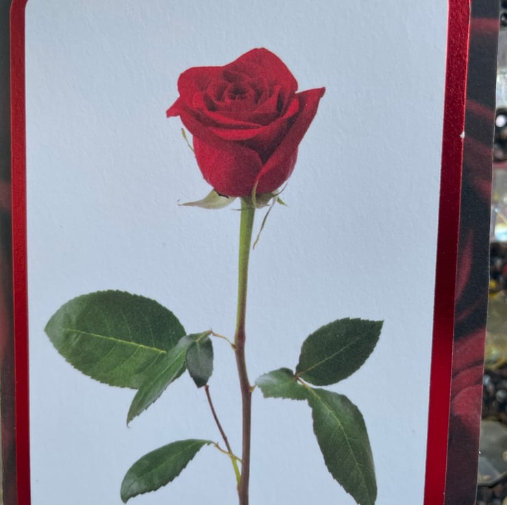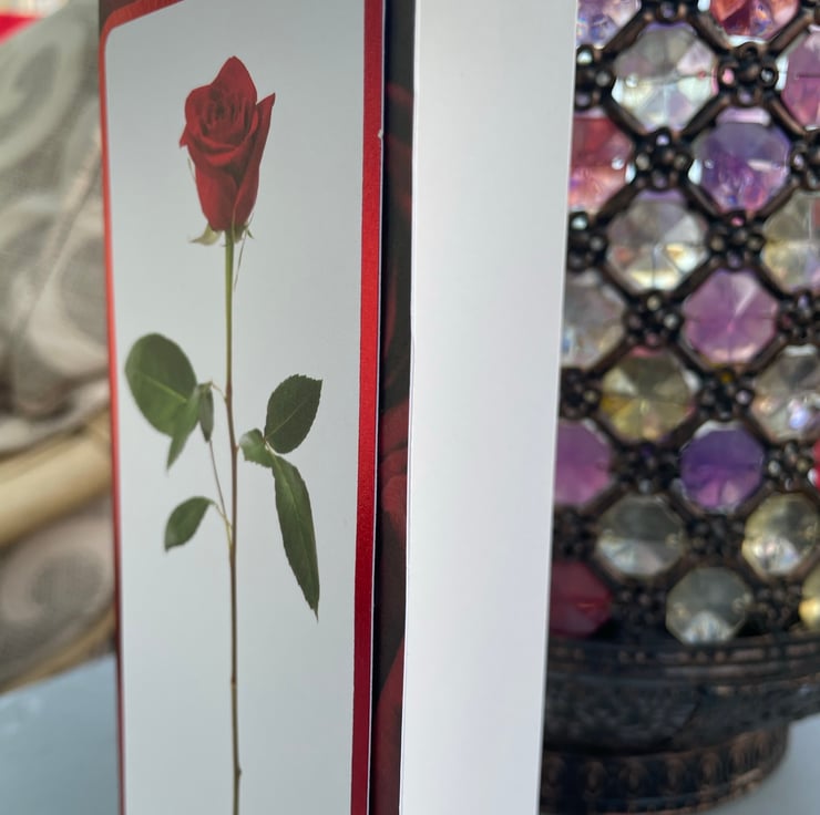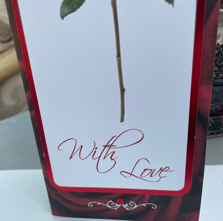 A classic and simple card to send to a loved one. This 20x8cm slimline card has a deep red rose backing card. This is topped by a longline topper featuring a single red rose. This has a greeting that says With Love and is edged with red foiling. The design is finished with a silver swirl and faux red gem. Inside the card is blank for your own message.