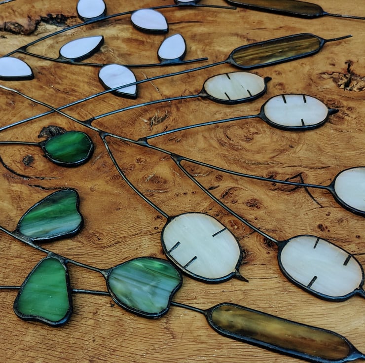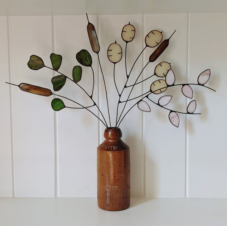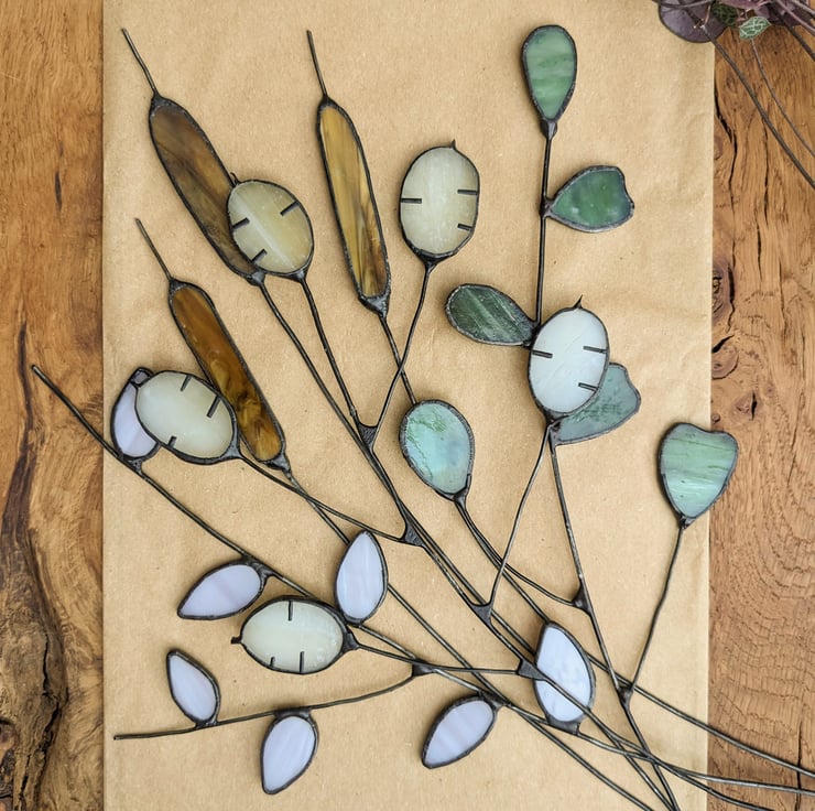 This stained glass flowers listing allows you to create your own custom bouquet of two-to-six stems at a small discount (vs. buying the stems individually) from the following stems across the collection: Pussy Willow, Eucalyptus, Honesty and Trio of Bulrushes (counts as one stem). Please select the number of stems at checkout, and list your choices in the Personalisation box; take a look at my other listings to identify the stems available and for more bouquet inspiration!