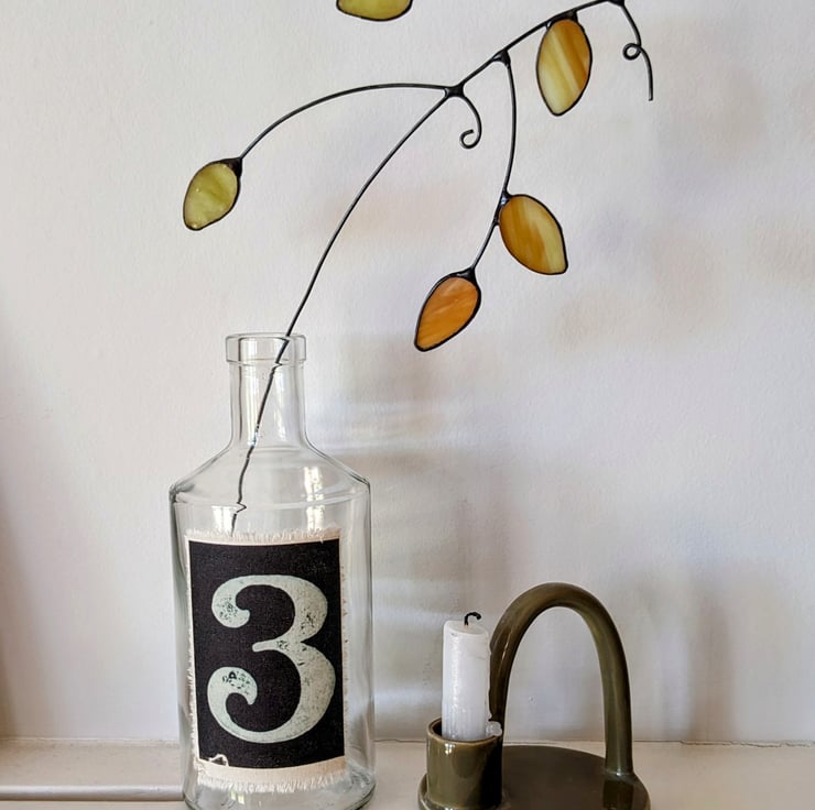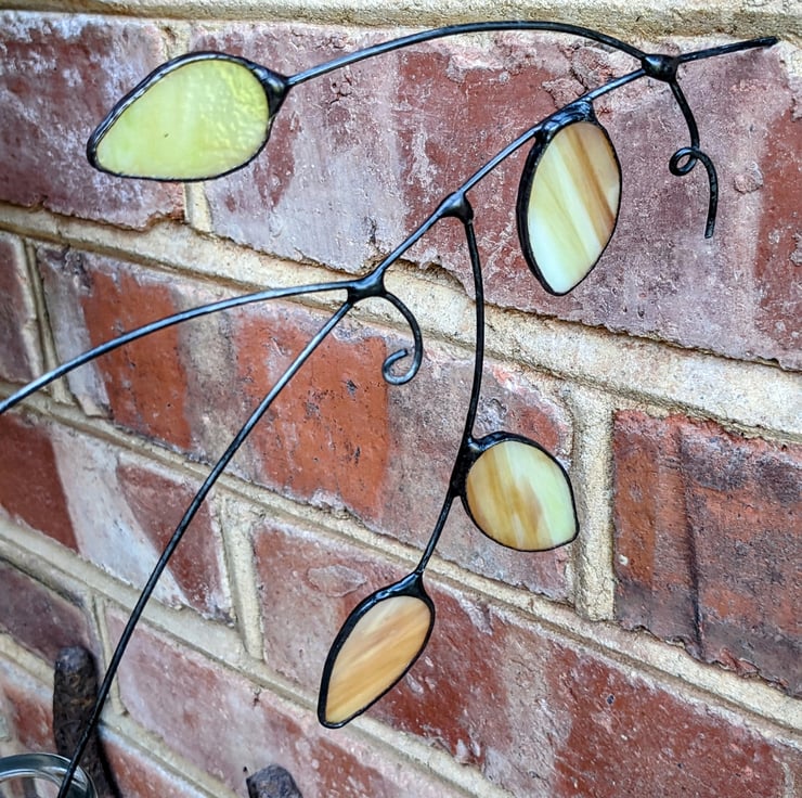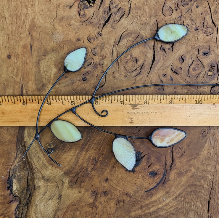 Being handmade, your stem will differ slightly from the photos as the glass shapes are cut entirely freehand replicating the variation seen in nature. The solder around the glass has a black patina, and the wire stem has a variegated gun-metal patina.