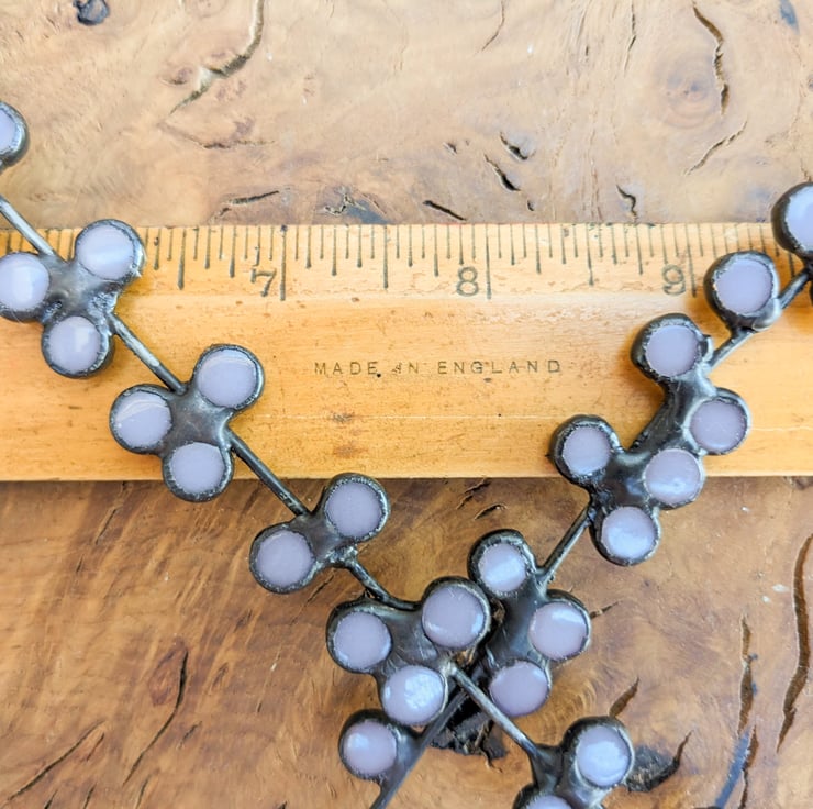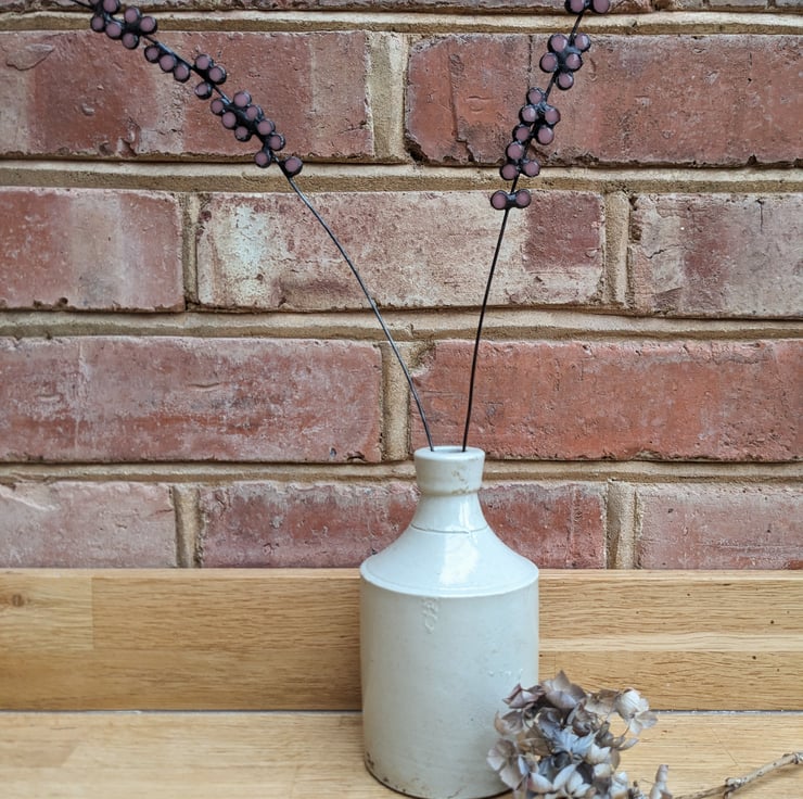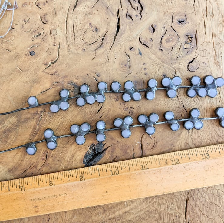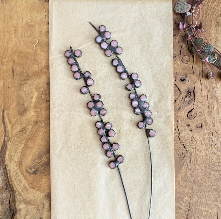 Being handmade, your stems will differ slightly from the photos as the glass shapes are arranged and soldered entirely freehand replicating the variation seen in nature. The solder around the glass has a black patina, and the wire stem has a variegated gun-metal patina.