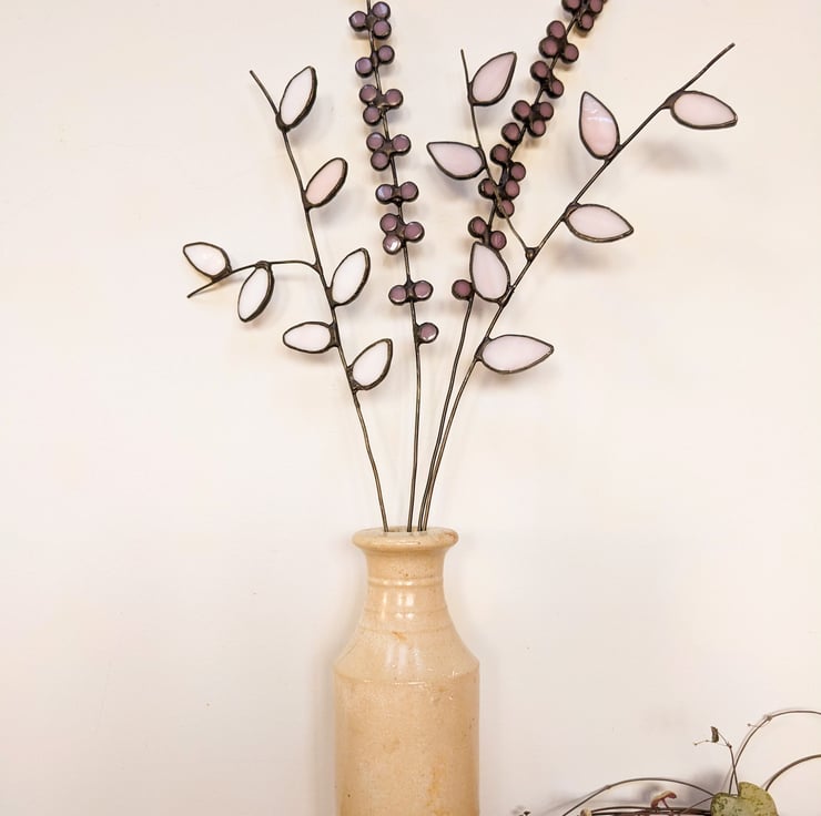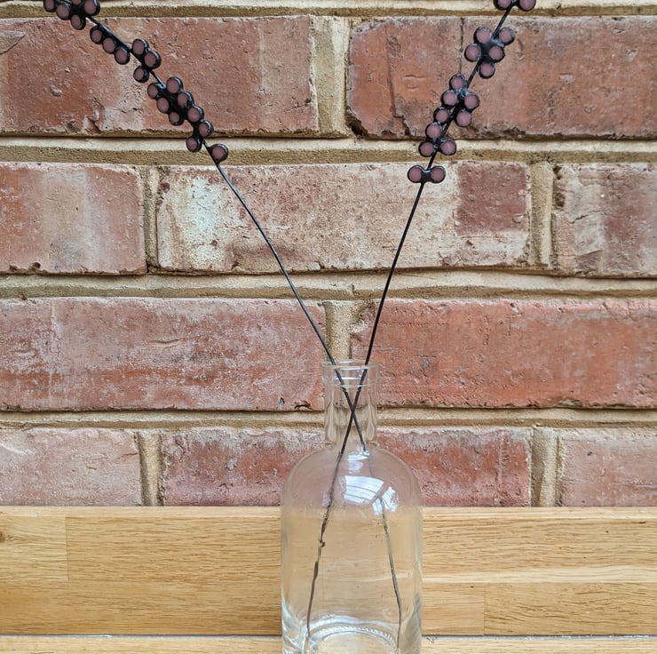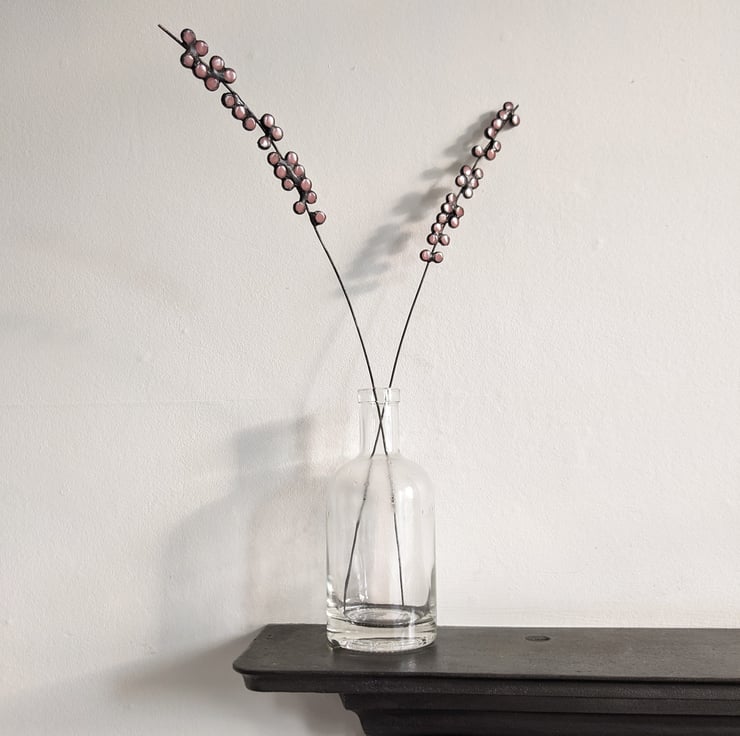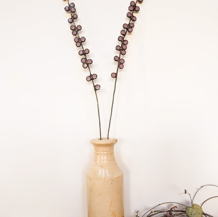 Stained glass flower "Duo of Lavender" in muted purple-pink glass (also available in white glass - please message at checkout). You receive two stems in this listing. Approximately 36 cm high, ideal for vases of 14-18 cm. You can cut the stems with kitchen scissors, and use uncooked rice in your vase to hold the stem in place.