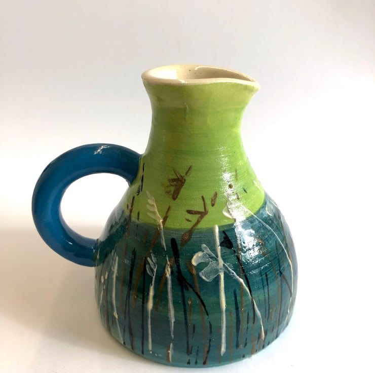 After biscuit firing to 950 degrees I painted the jug using coloured underglazes taking my inspiration from lakeside reed beds...and as always the stems were painted with a credit card and the seedheads with the side of a scruffy old paintbrush...funny how the oddest, cheapest tools often give the best finish!