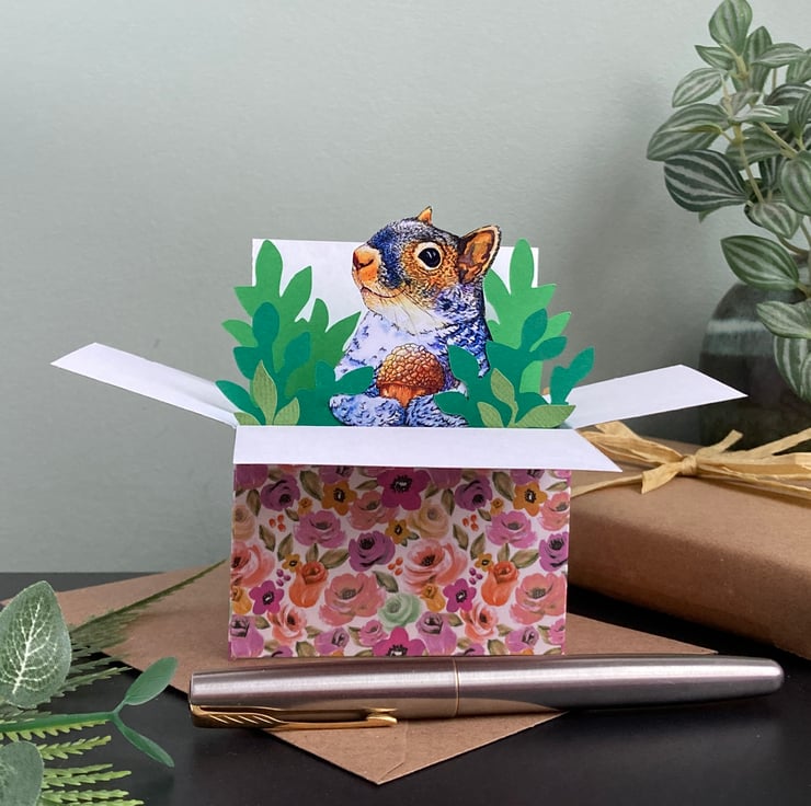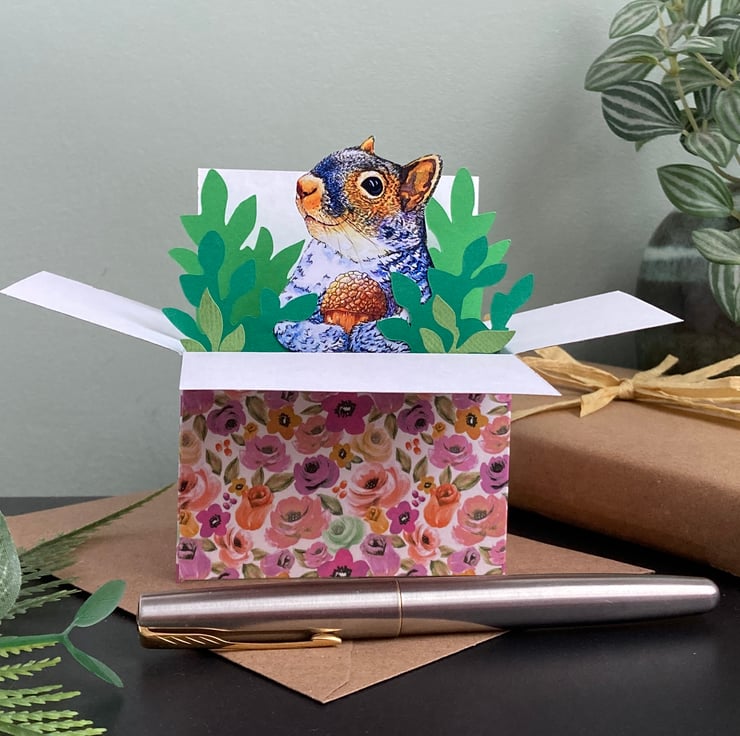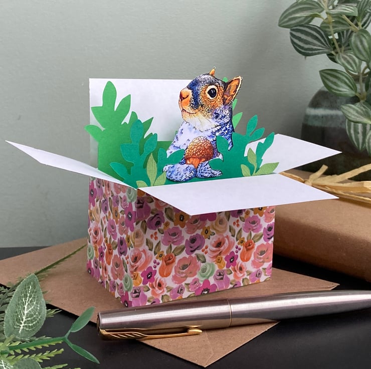 This 3D squirrel box card can be personalised for any occasion: birthday, Easter, Mother’s Day, Father’s Day, Thank you, Wedding, Anniversary, etc. Every element has been designed, drawn, cut and assembled by me including my illustration of a grey squirrel.