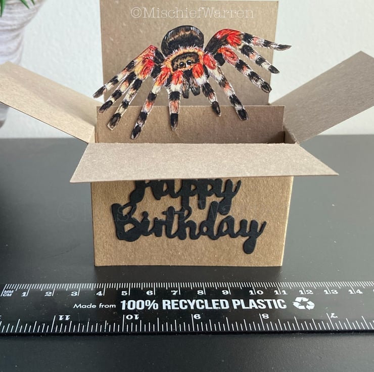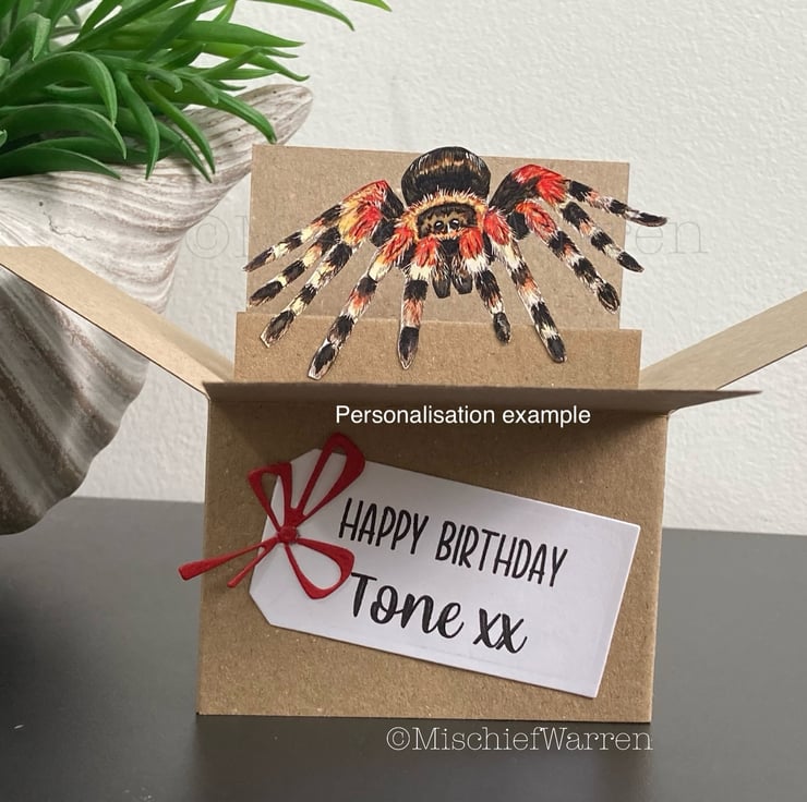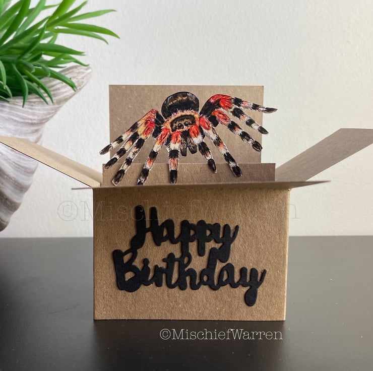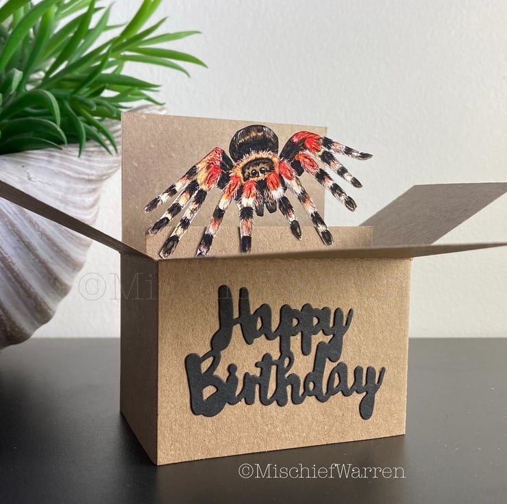 Every element has been designed, drawn, hand cut and assembled by me including my illustration of a tarantula spider. I can add the sentiment Happy Birthday cut from card to the front or print a tag with whatever message you'd like.