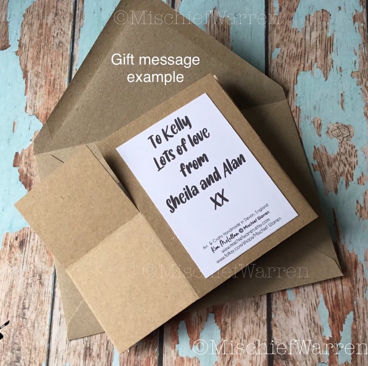 This 3D card has a blank panel on the reverse for you to write your own message - or I can add something for you (just add a gift message) - or I can add a gift card pocket for you (see options).