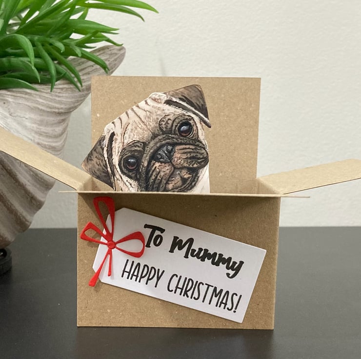 My own painting of a pug dog peeping out from a recycled card “box”. With the option to add a little pocket for a standard sized gift card making it a great gift for pug lovers
