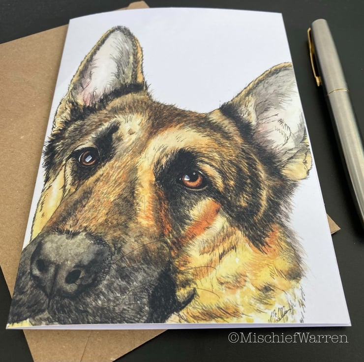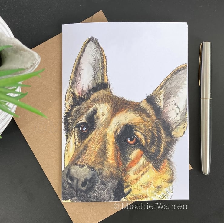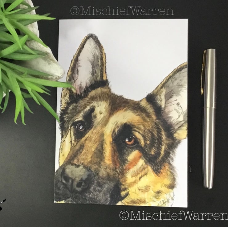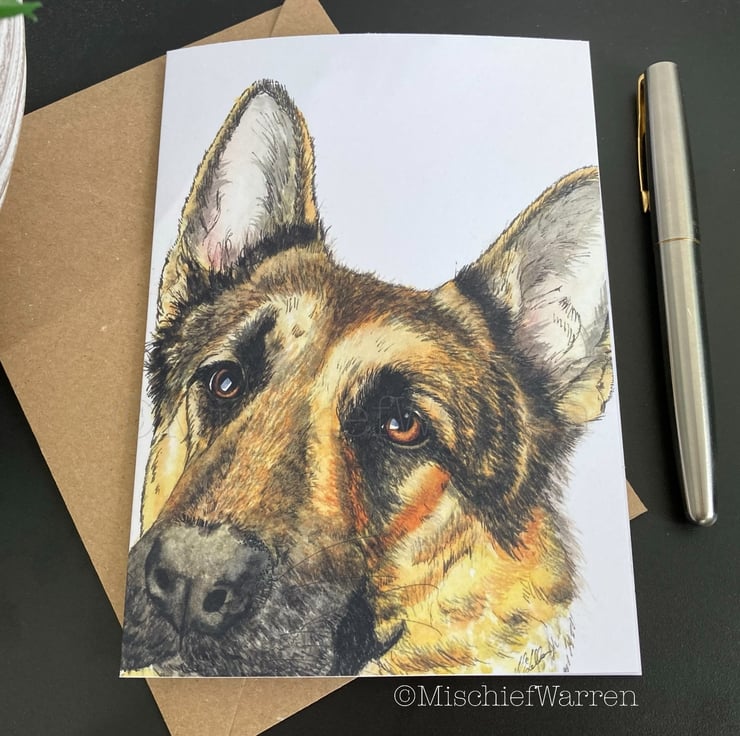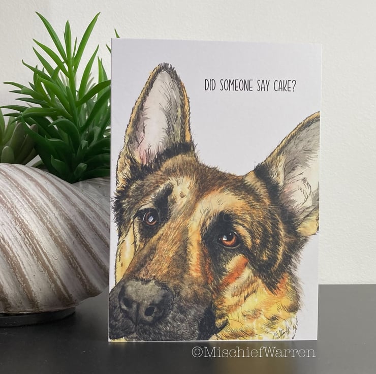 This German Shepherd card features a print of my ink and watercolour illustration of a German Shepherd dog. Designed, hand drawn, hand painted and printed by me. Can be personalised for any occasion; birthday, Easter, Valentine’s day, Mothers Day, Fathers Day, Thank you, Congratulations or Christmas perhaps. I like “Did someone say cake?” which covers any celebration involving cake including retirement and wedding. Blank inside, or I can add your message and/or send direct to the recipient.