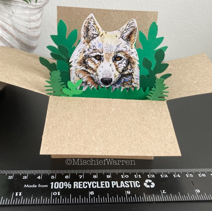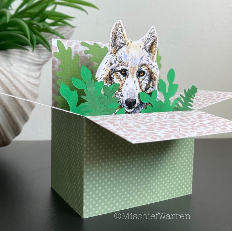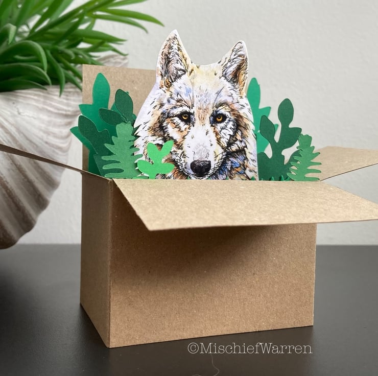 Wolf in a box card. A white wolf peeking out from the greenery in this little box card, perfect for any wolf lover. This wolf card can be blank, personalised with a printed tag on the front for any occasion: birthday, mothers day, fathers day, thank you, congratulations – anything you like. Every element has been entirely designed and handmade by me.