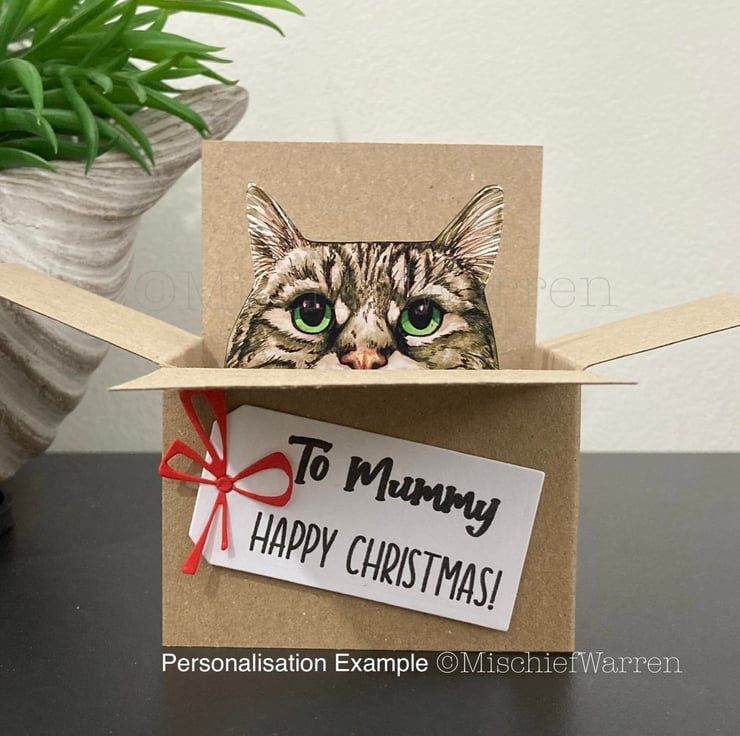 The recycled kraft card “box” folds open to reveal a peeking grey tabby cat with green eyes. Designed and handmade entirely by me (including my tabby cat painting) here in Devon. The purrfect gift card for cat lovers.