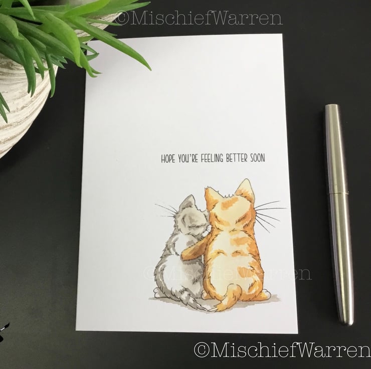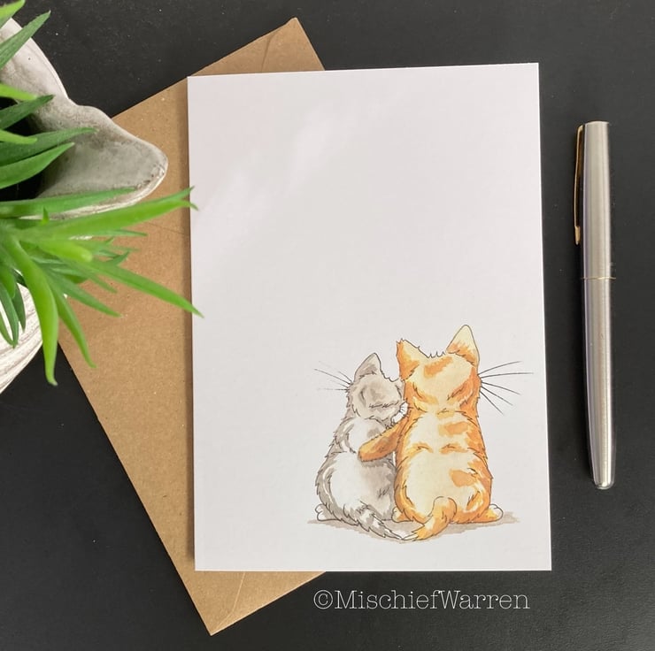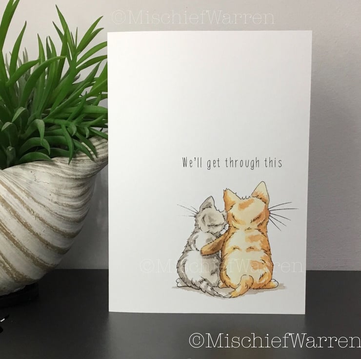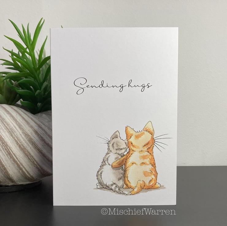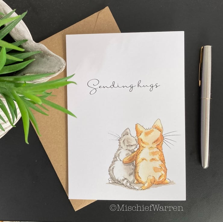 Designed, illustrated and handmade entirely by me, this card features two kittens hugging. Suitable for many occasions (divorce, break-up or loss for instance) and can be personalised with any message you like - please just ask. "Sending Hugs" or "Thinking of you" or "I'm here for you" perhaps. Perfect for anyone who needs cheering up or just to know someone is there for them. I can also print your chosen text on the inside of the card for you (just add a gift message) and can send direct to the recipient to save you time.
