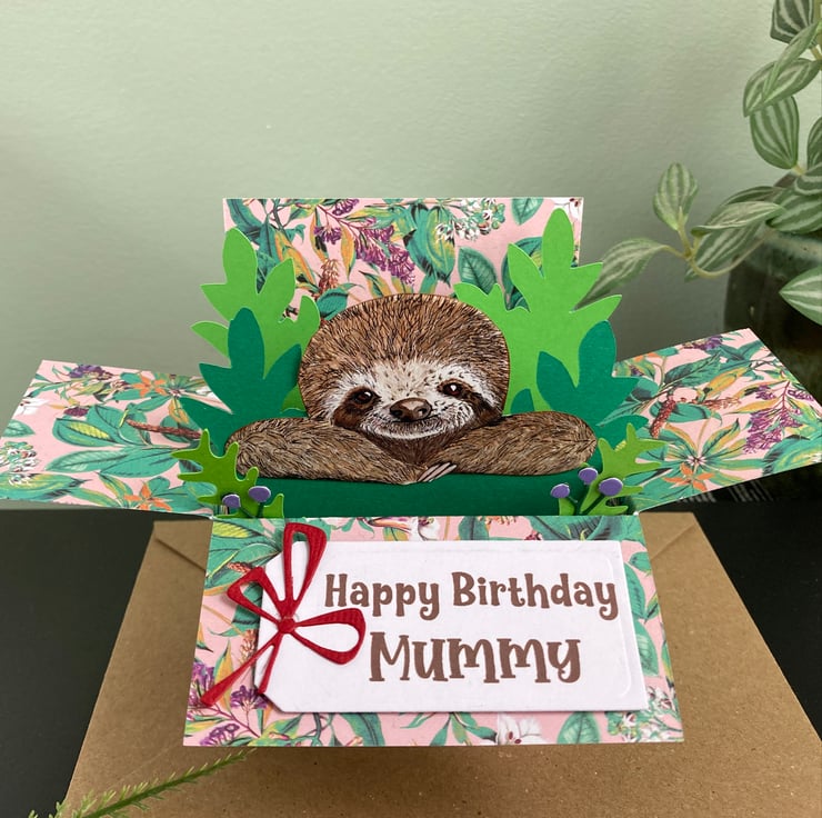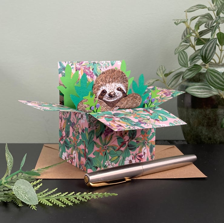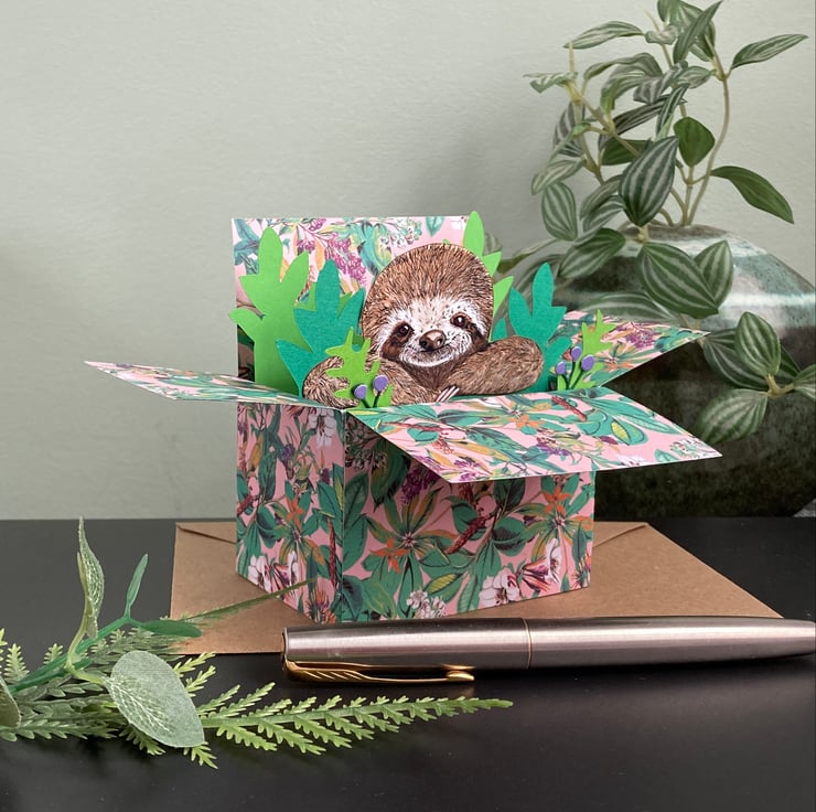My Sloth card can be personalised for any occasion: birthday, Thank you, Mother’s Day, Father’s Day, Congratulations, etc. or left blank. Every element of this sloth in a box card has been designed, drawn, cut and assembled by me including my ink and watercolour illustration of a sloth and foliage cut from green card.