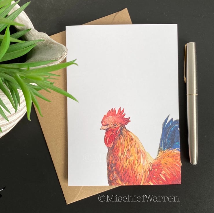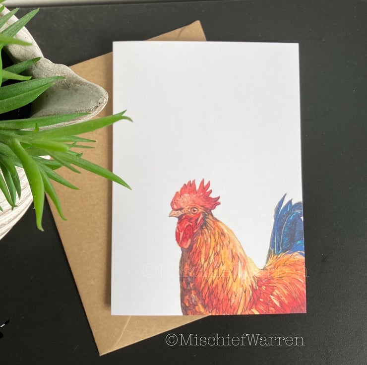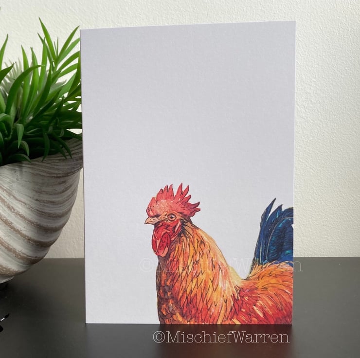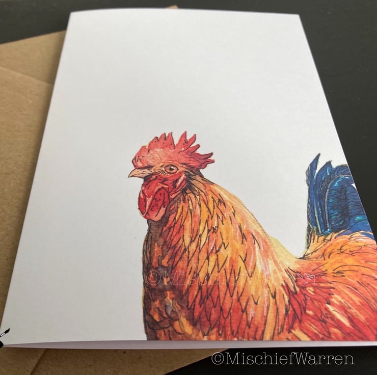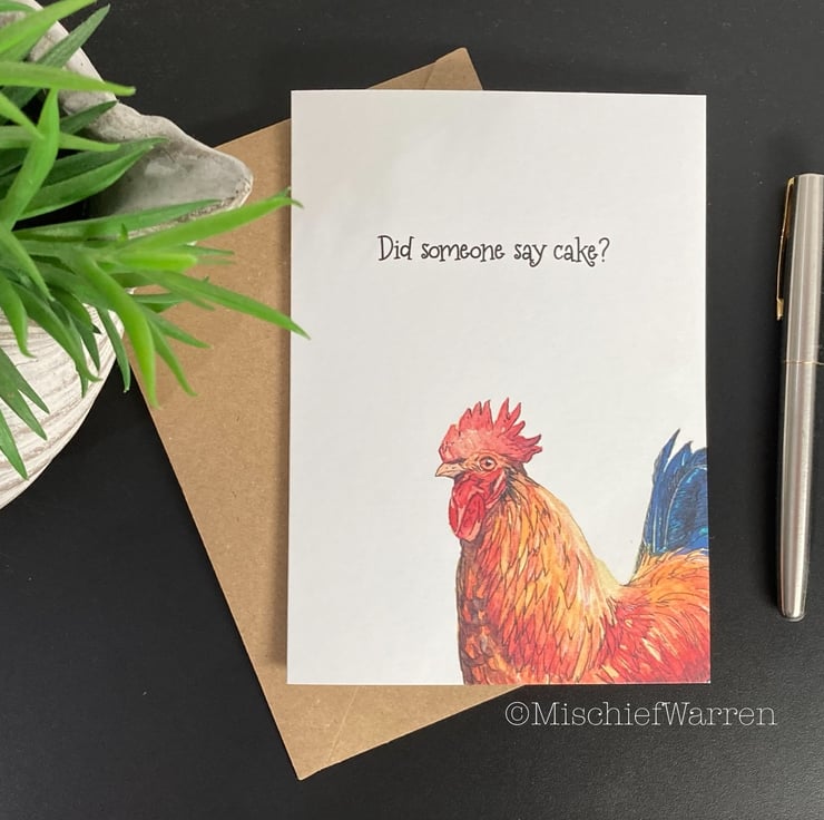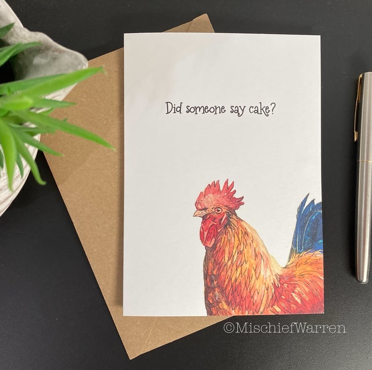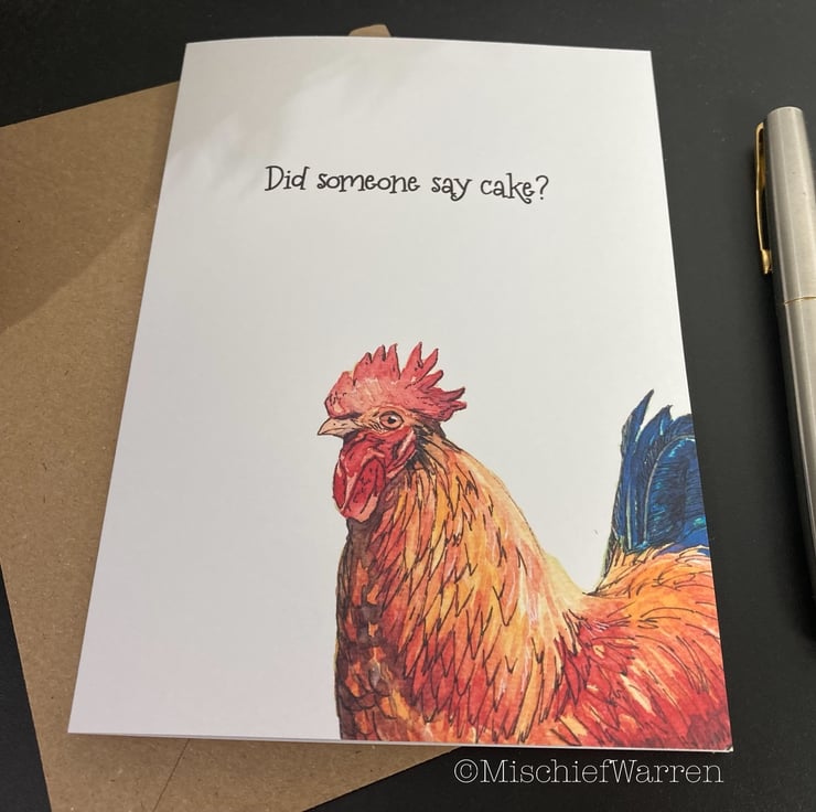 This cockerel card features a print of my ink and watercolour illustration of a very handsome rooster. Great for chicken lovers. This card can be personalised for any occasion. I like “Did someone say cake?” which covers a multitude of uses; Birthday, Wedding, Anniversary or any other celebrations involving cake! I can also write a message on the inside and/or send direct to the recipient, should you wish.