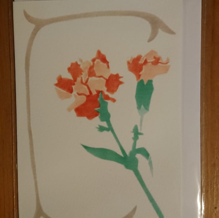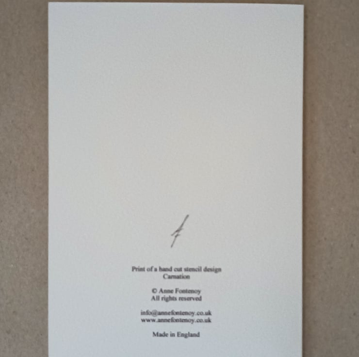 I made the original design from hand cut stencils based on drawings I made of a spray of carnation flowers. I airbrushed the image onto fine art paper. I have scanned an original airbrush card. Using a desktop inkjet printer I print these cards onto Bockingford 190 gsm digital fine art paper with archival inks.