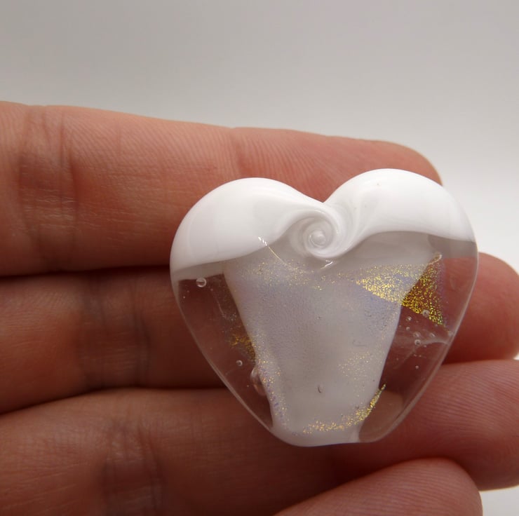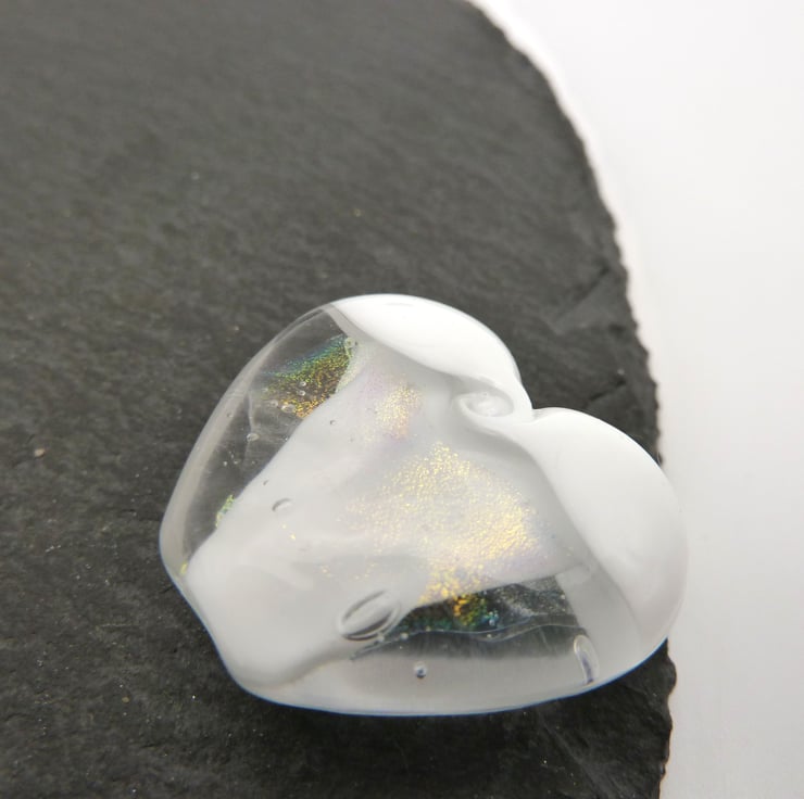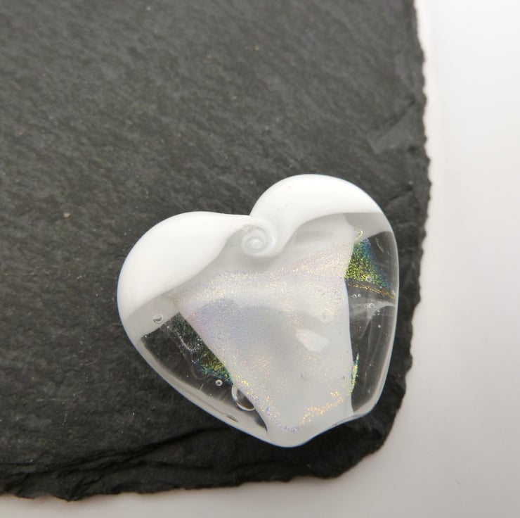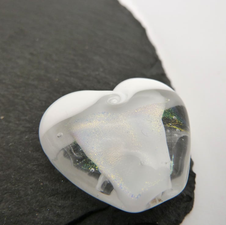 A lampwork glass beads made with white and dichroic glass. The bead has been shaped into a heart using a brass press.