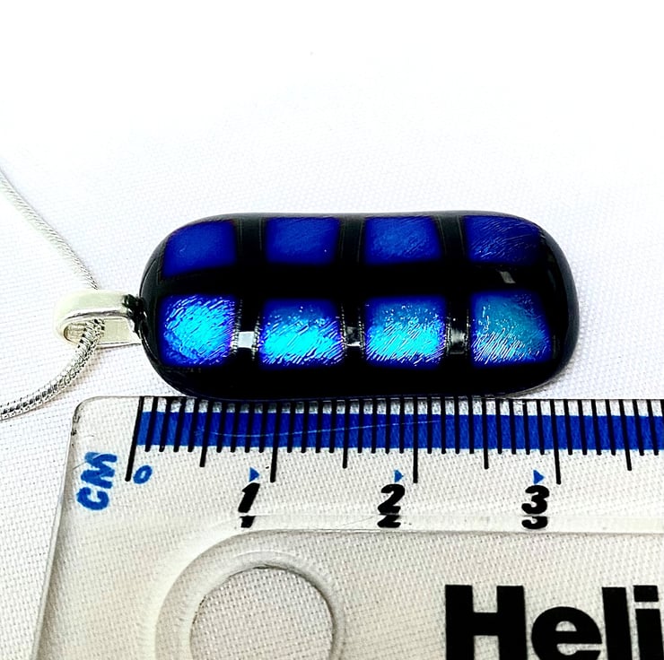 A beautiful vibrant dichroic pattern glass pendant using hand cut glass fused at 800 degrees Celsius. Measuring approximately 14mm across and 33mm long this unique pendant is hung on an 18 inch silver plated snake chain.