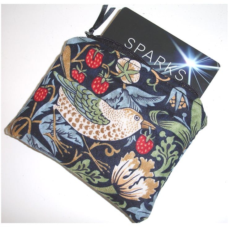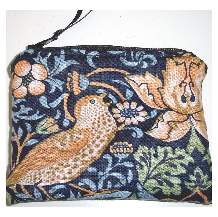 A beautiful Liberty of London Arts and Crafts Movement fabric in the William Morris Design The Strawberry Thief - featuring the Strawberry Thief and Song Thrush - one on each side of the purse. Colour Palate - Dark Blue / Red / Beige / Green.