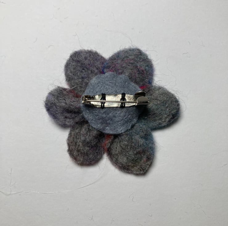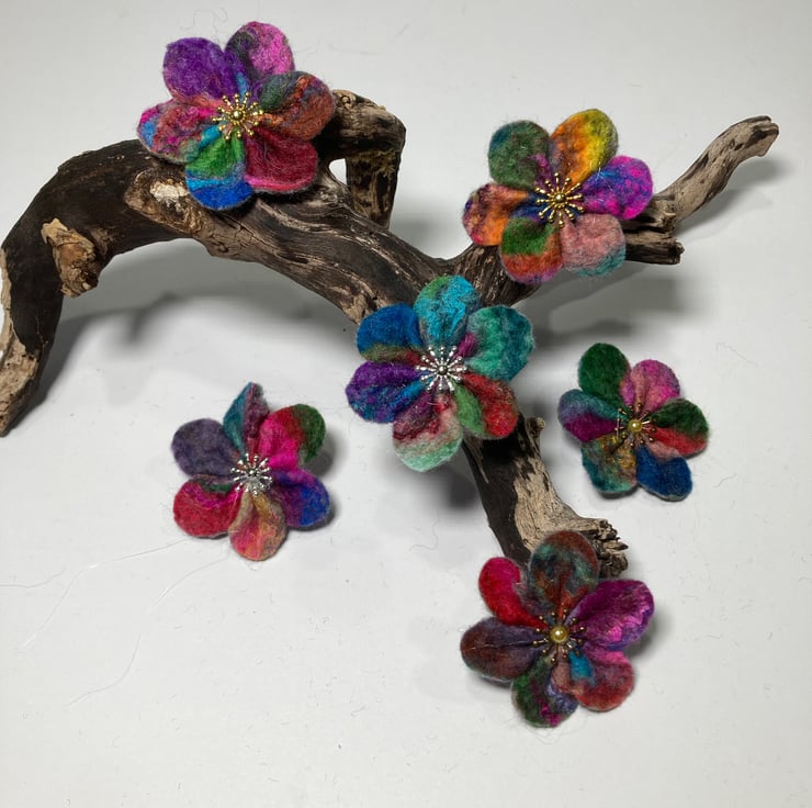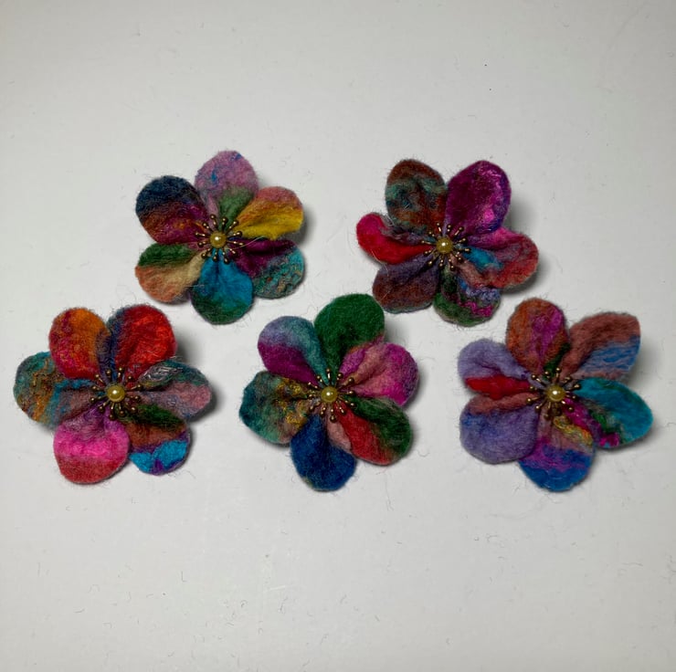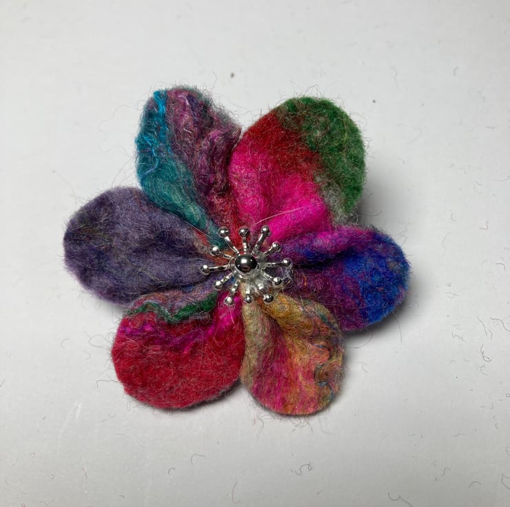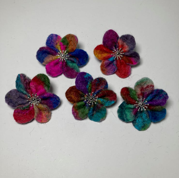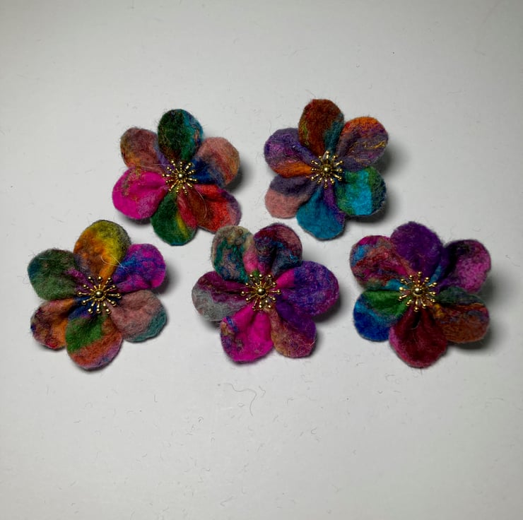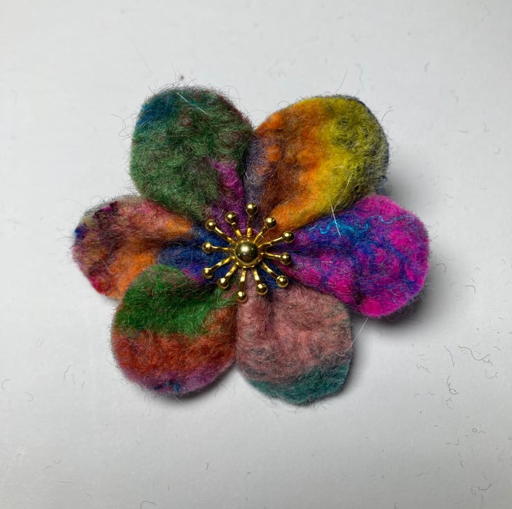 These beautiful, bright, multicoloured felt flowers make a stunning addition to any outfit. The flowers are made from a piece of hand felted merino wool felt in an array of bright colours. The flowers have been cut with rounded petals and have a central stamen which can be chosen as desired from gold, silver or antique bronze (please select from drop down list). On the reverse a silver tone brooch pin has been added.