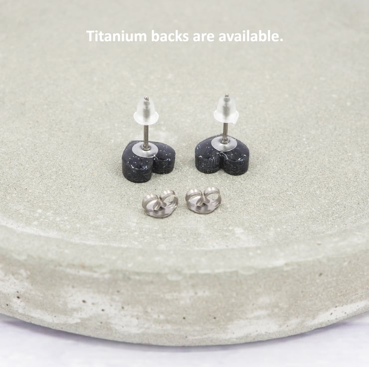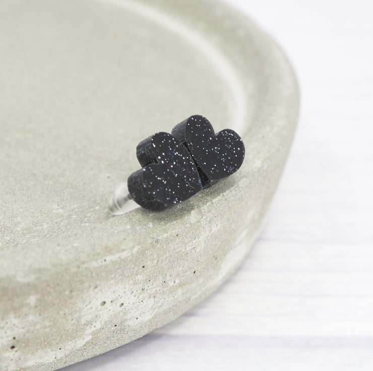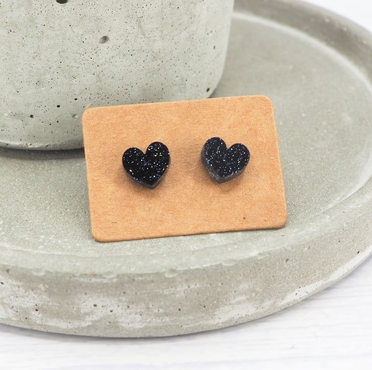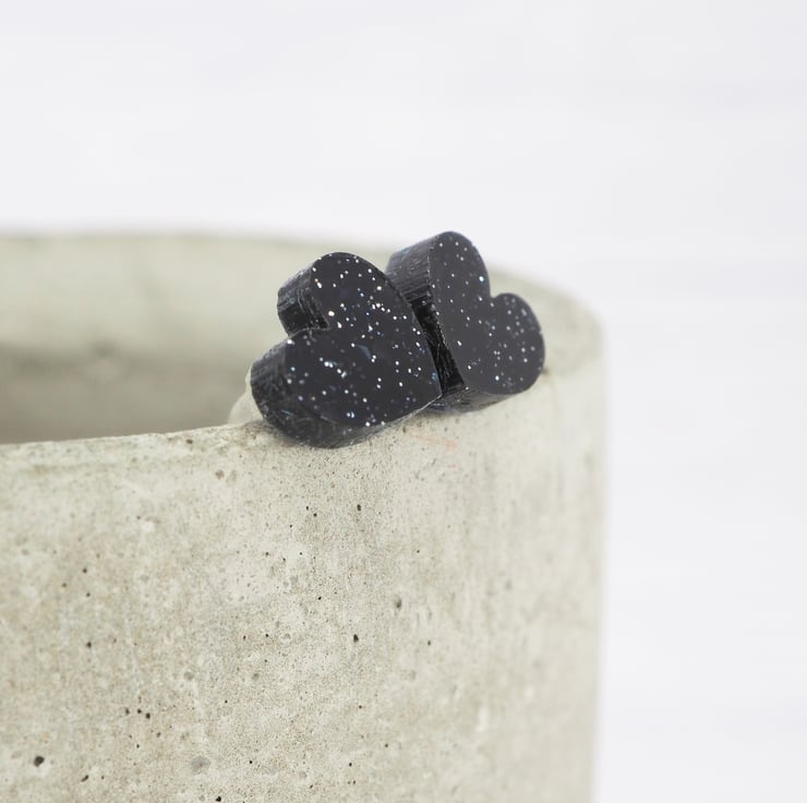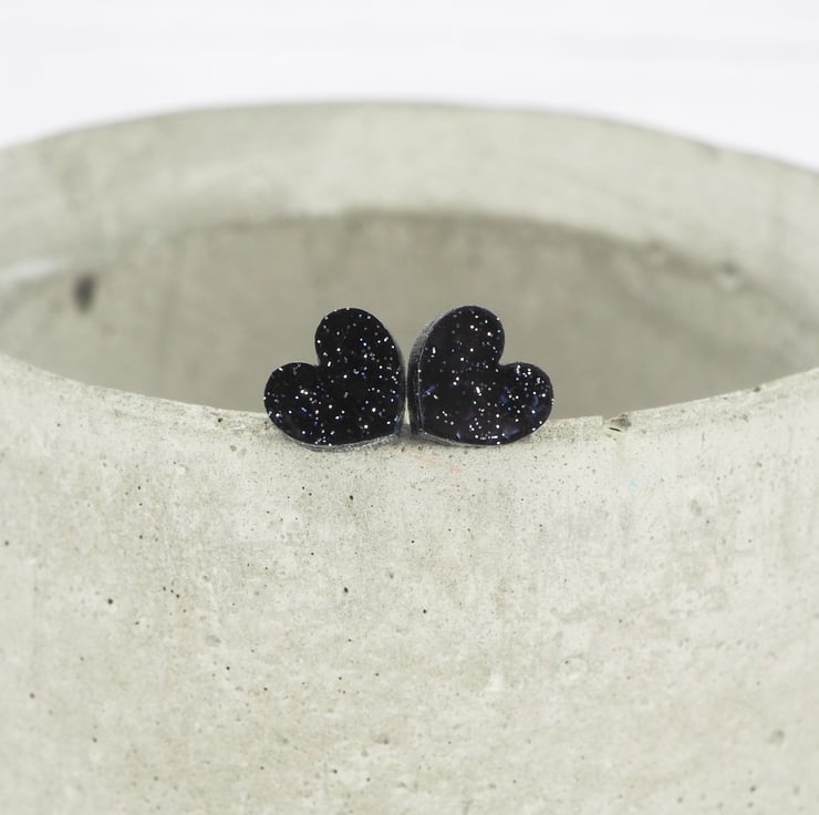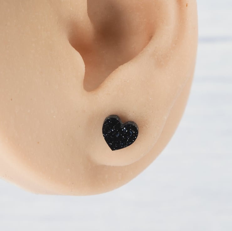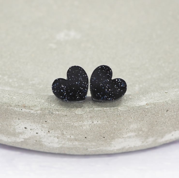 Black glitter small heart acrylic studs with 0.7mm ear stems.