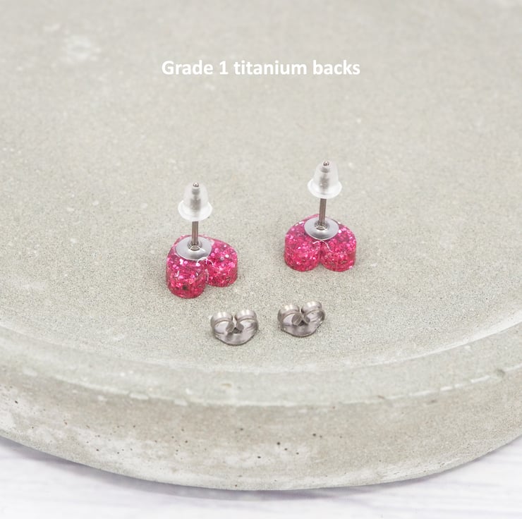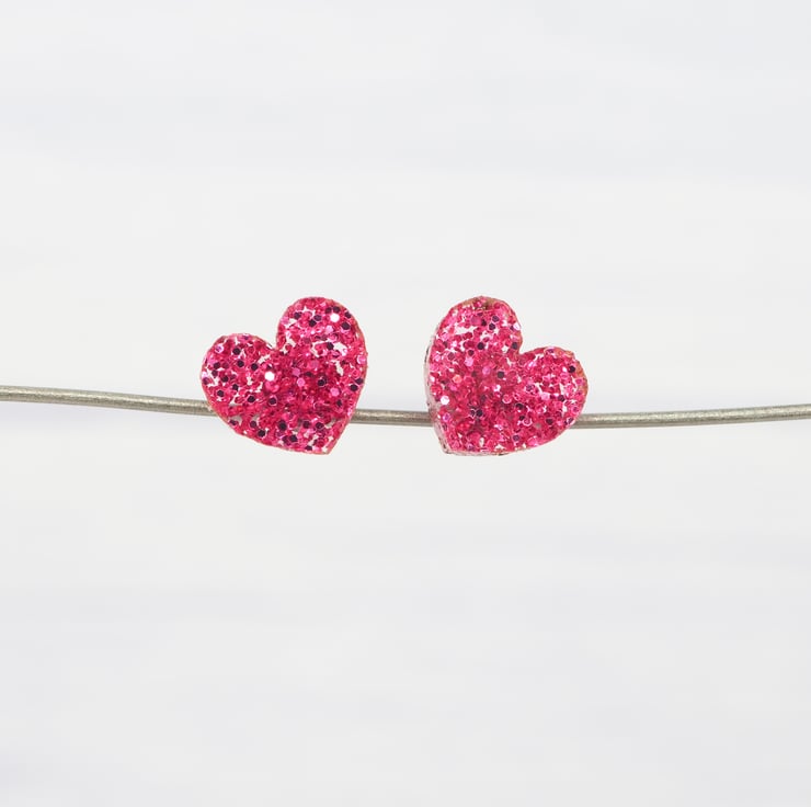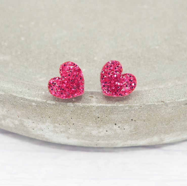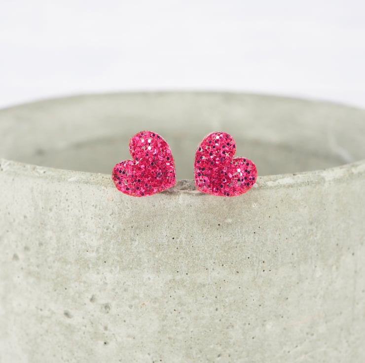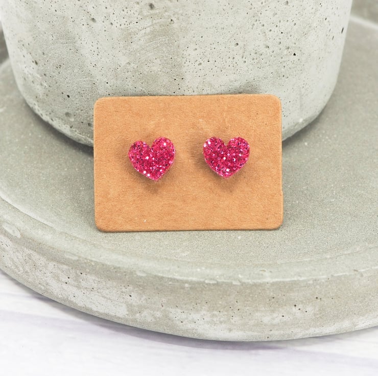 Pink glitter small heart acrylic studs with 0.7mm ear stems.