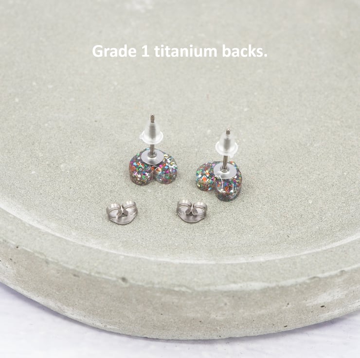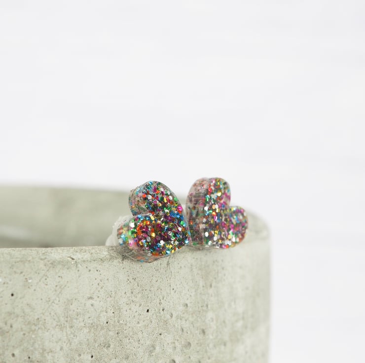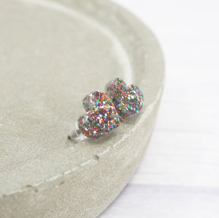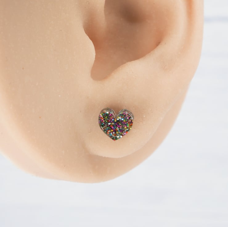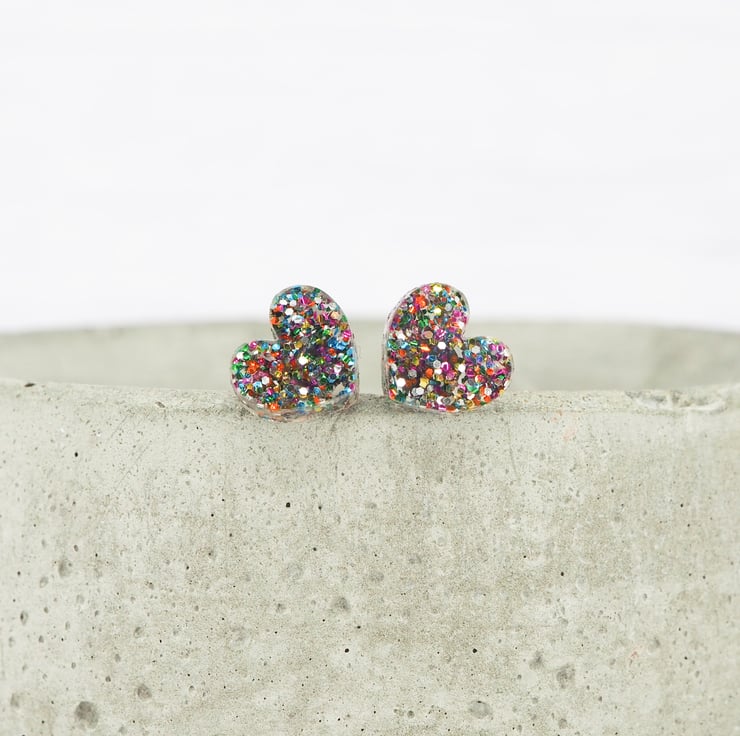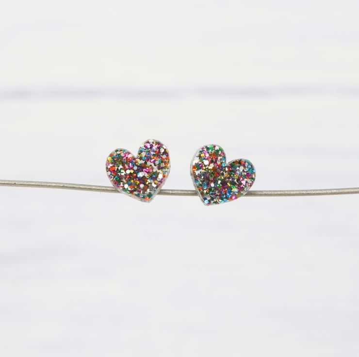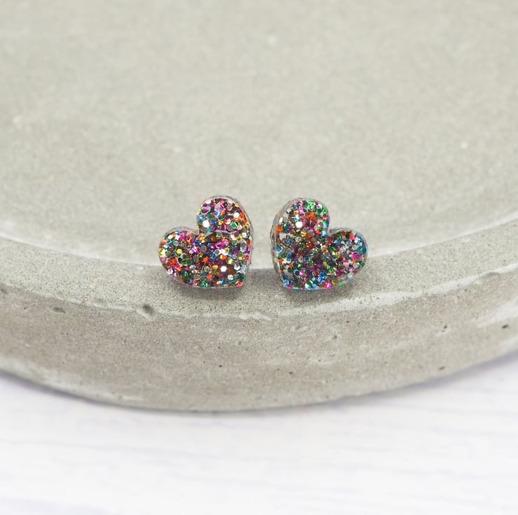 Mixed glitter small heart acrylic studs with 0.7mm ear stems.