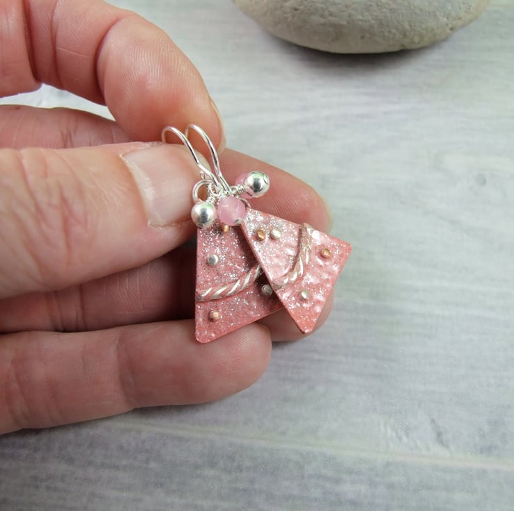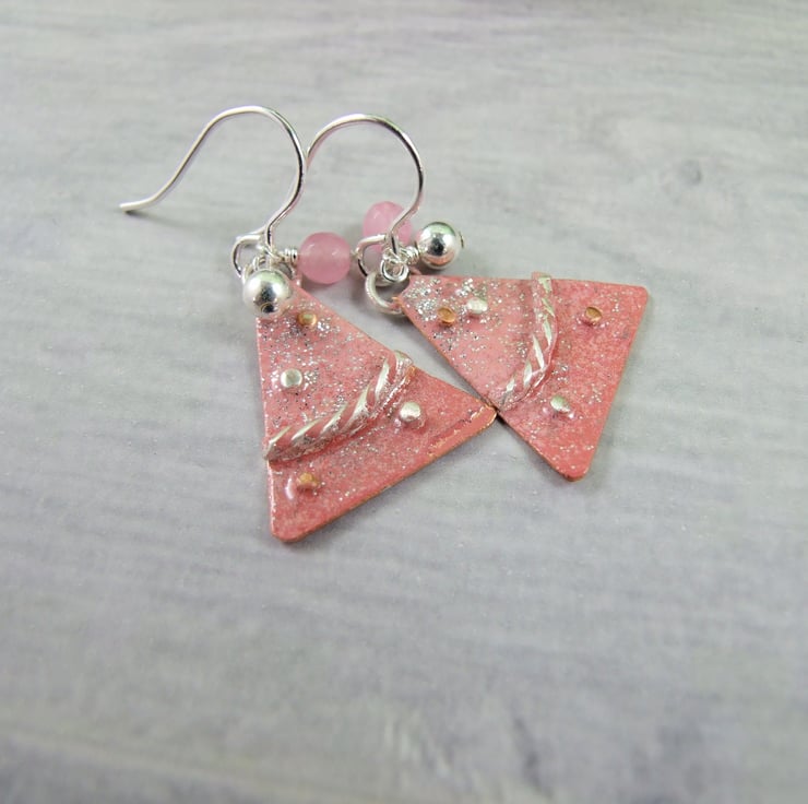 Christmas Earrings. Sterling silver and copper with Pink enamel and silver and agate beads.