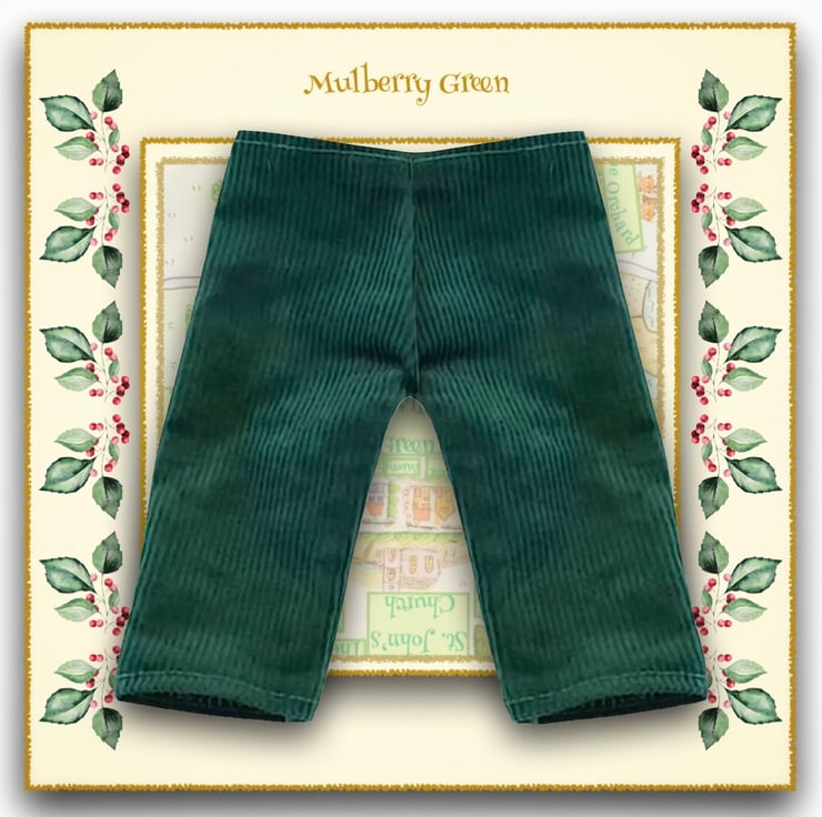 A pair of cute little teal cord trousers, made to fit the Mulberry Green characters. They are fashioned just like grown up ones and are made from good quality cotton corduroy.