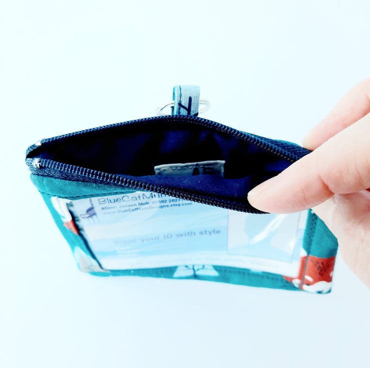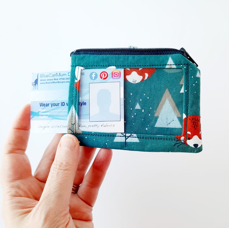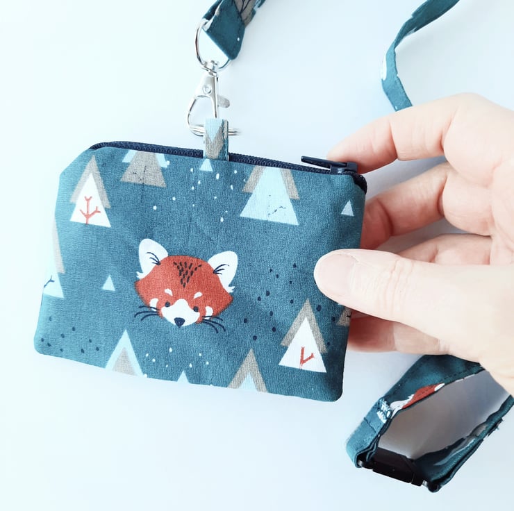 A purse and Lanyard set, with foxes! This small purse clips to the lanyard with the key ring, and hangs down horizontally. Hold some money safe in the zip purse or some other treasures. It will even hold a couple of bank cards.