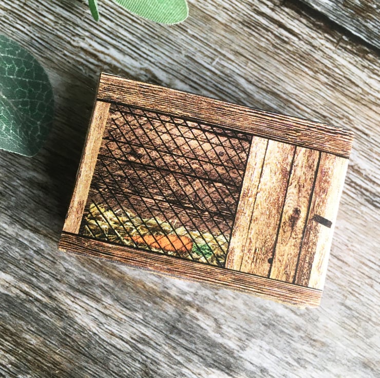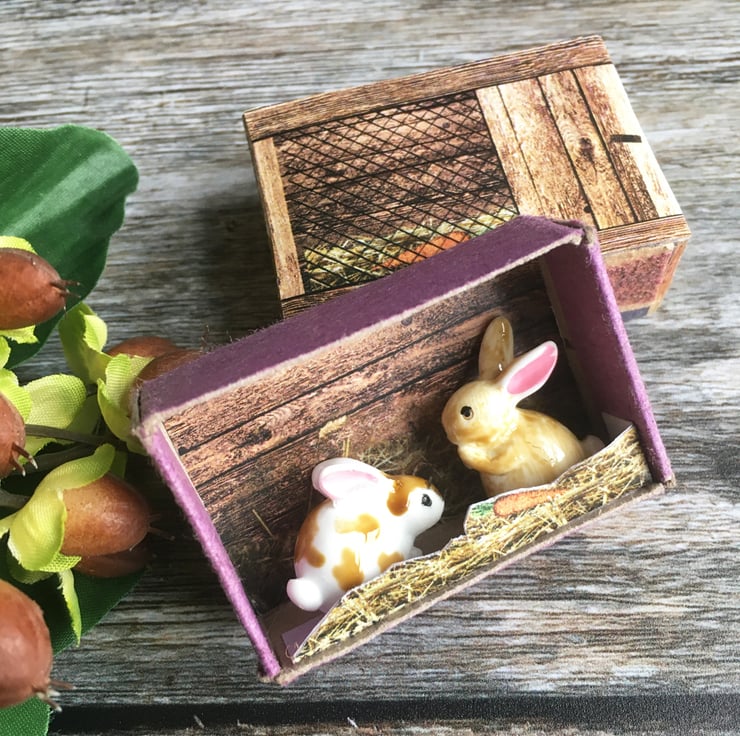 This diorama is housed inside a vintage matchbox. I've covered the top label and made the scene inside using colour paper copies backed with card. Apparently rabbits don't like to live on their own so I've added two tiny resin ones which I've painted with a very small brush!