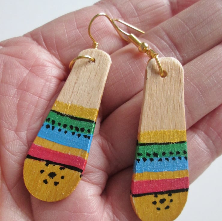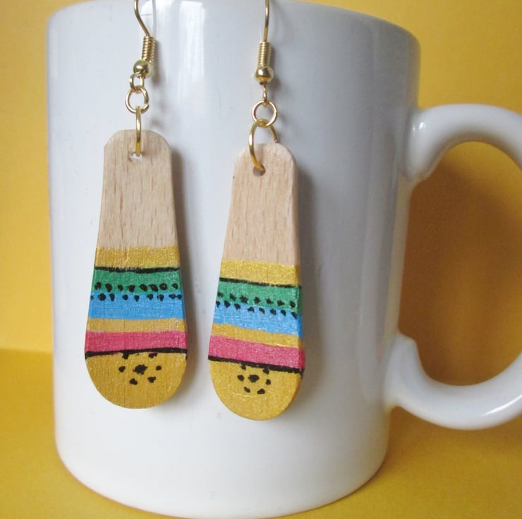 A lovely set of earrings ready for her. These stylish wooden earrings are hand painted in gold and acrylic paint.