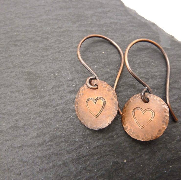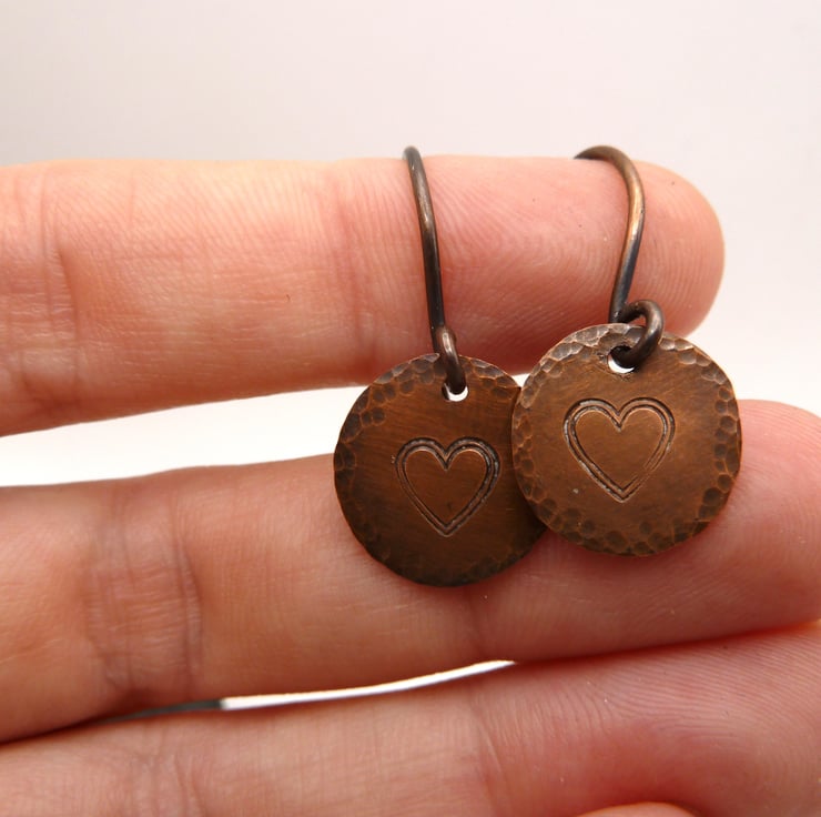 A pair of earrings made with handmade copper ear wires and handmade copper disc charms which have been stamped with a heart.