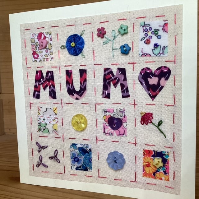 A beautifully made patchwork style card especially for your mother. It has been intricately hand-stitched which makes it a perfect, one of a kind keepsake card. The wording 'mum' is surrounded by pretty squares of fabric which have been stitched with buttons, beads and embroidery. It is perfect for a special birthday or Mother’s Day and could easily be framed for a lasting gift. It is made on calico and backed onto recycled kraft card with matching envelope and is left blank inside for your own message. It measures 12.5 x 12.5cm. All of my cards are carefully wrapped in cellophane and tissue paper and sent out within one day of purchase.