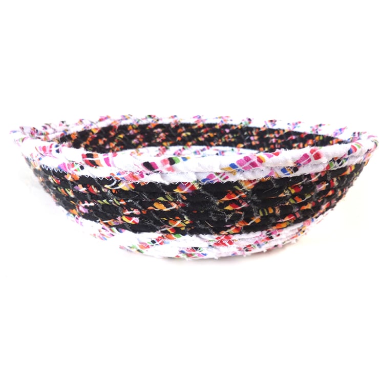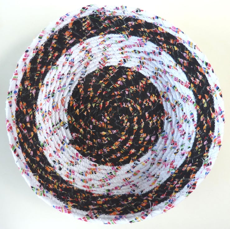 One of a kind - a shallow coiled fabric basket in black and white cotton with a recurring pop of colour.